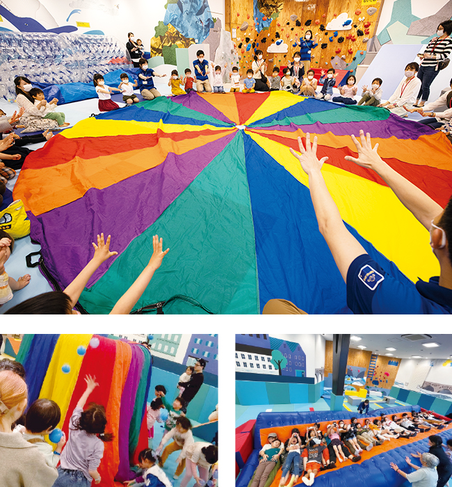 大きな丸い布の端を全員で持って、中に入ったり高く持ち上げたり。ダイナミックな動きに大人も歓声!