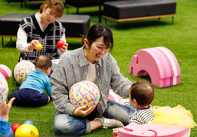 プレイリーダーと一緒に、親子で体を動かしながら、ボール遊びを楽しむプログラム。子どもの成長に必要な動きをバランスよく身につける JFA プログラム「めざせクラッキ!」※の様々な動作に、発達段階に沿ったあそびの要素と多様な遊具を組み合わせ、生後6ヶ月〜6歳までが年齢別に楽しめます。