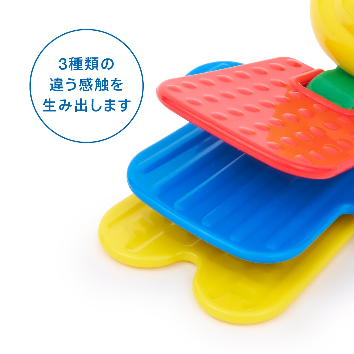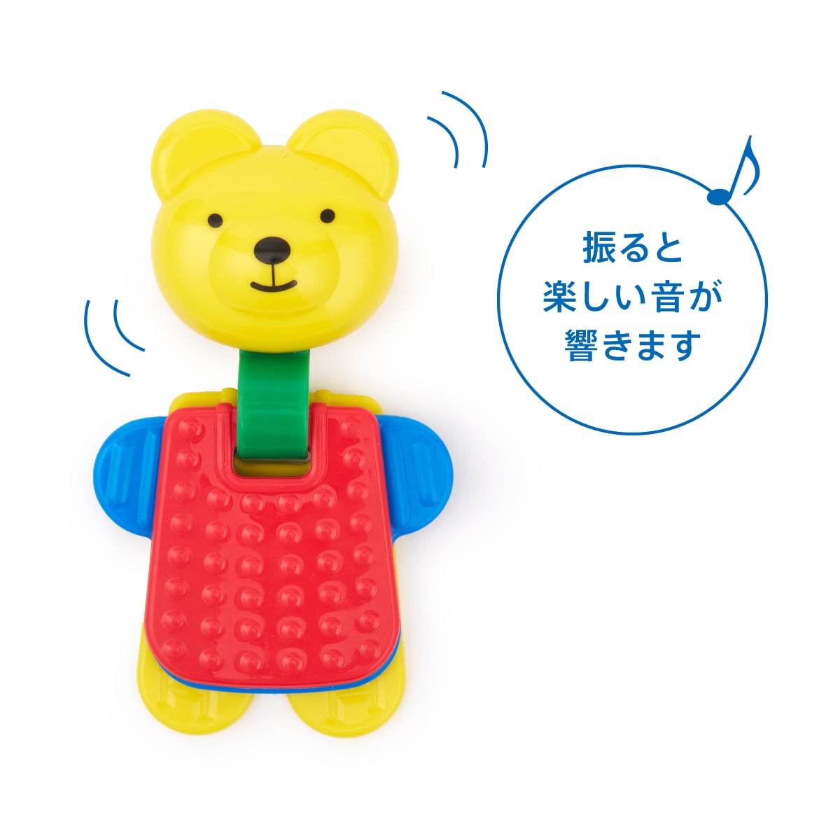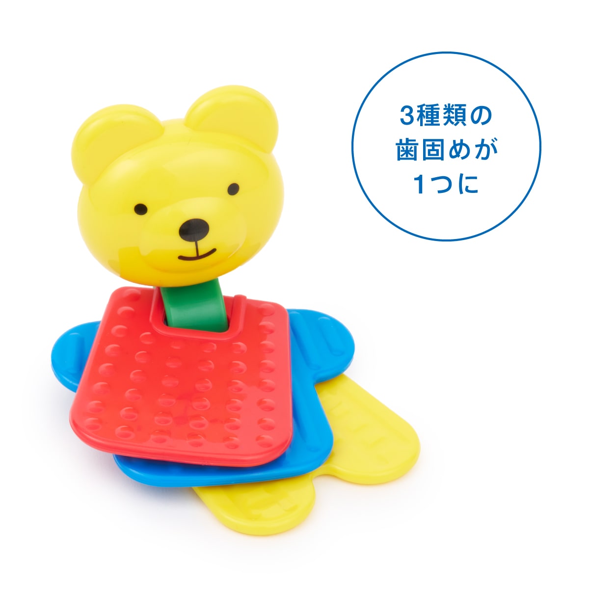 クマのお洋服は3種類。色形・模様が異なるお洋服部分は、五感を刺激し色々な感触が楽しめます。なめれる、しゃぶれる、噛めるクマちゃんは振るとビーズの音が楽しく鳴ります。