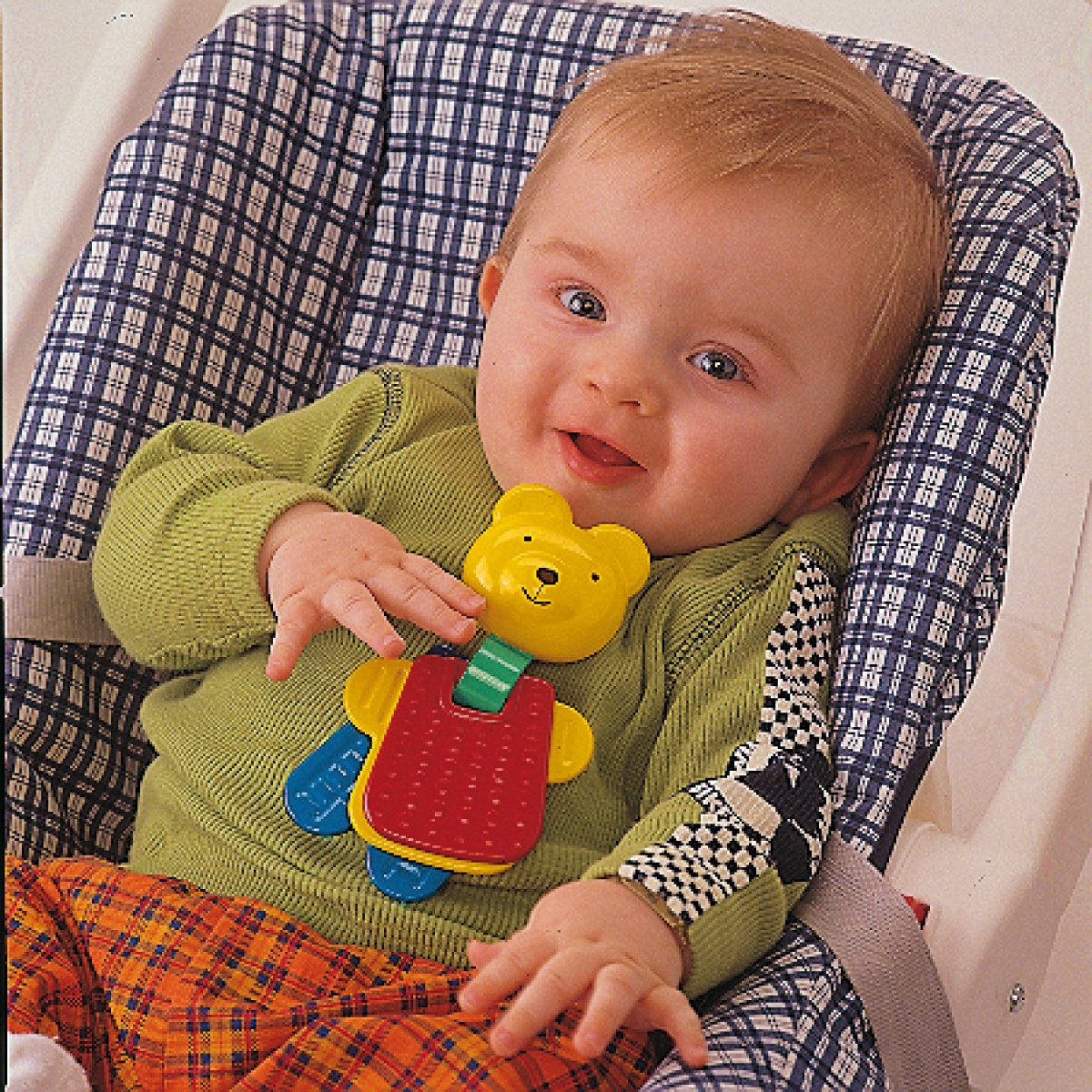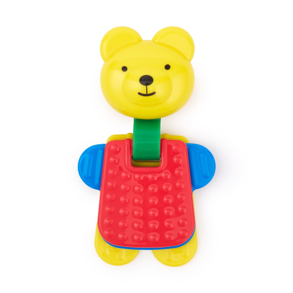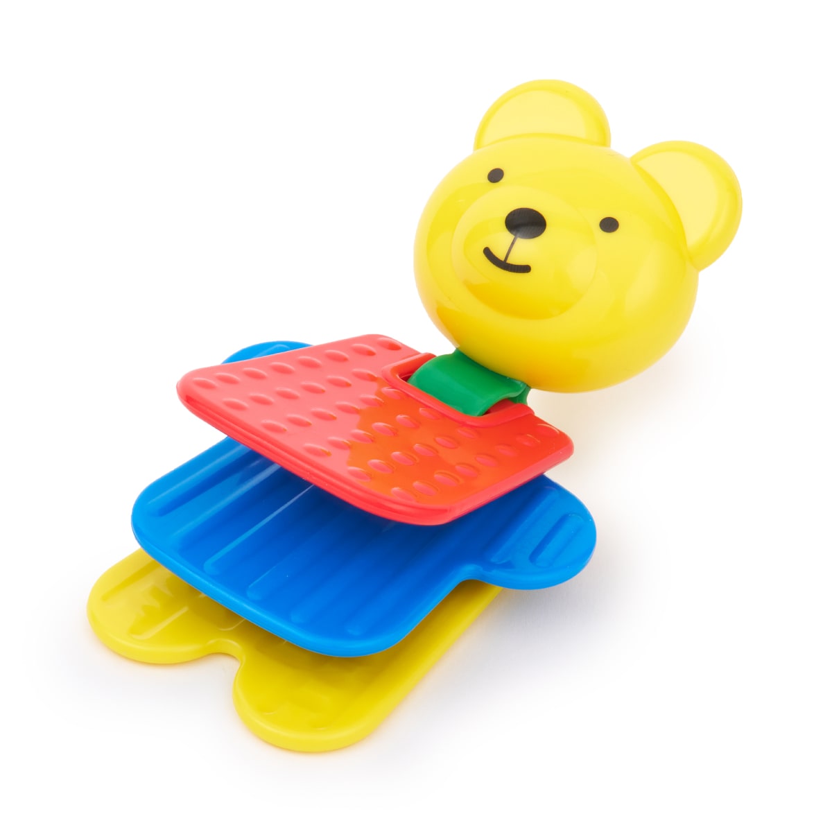 クマのお洋服は3種類。色形・模様が異なるお洋服部分は、五感を刺激し色々な感触が楽しめます。なめれる、しゃぶれる、噛めるクマちゃんは振るとビーズの音が楽しく鳴ります。