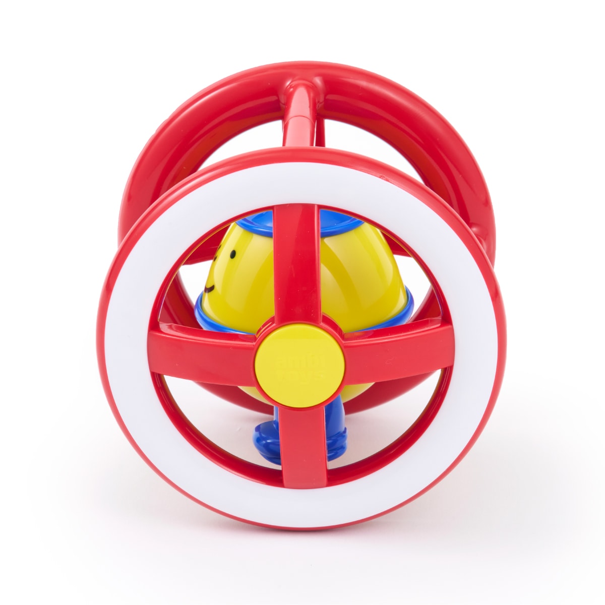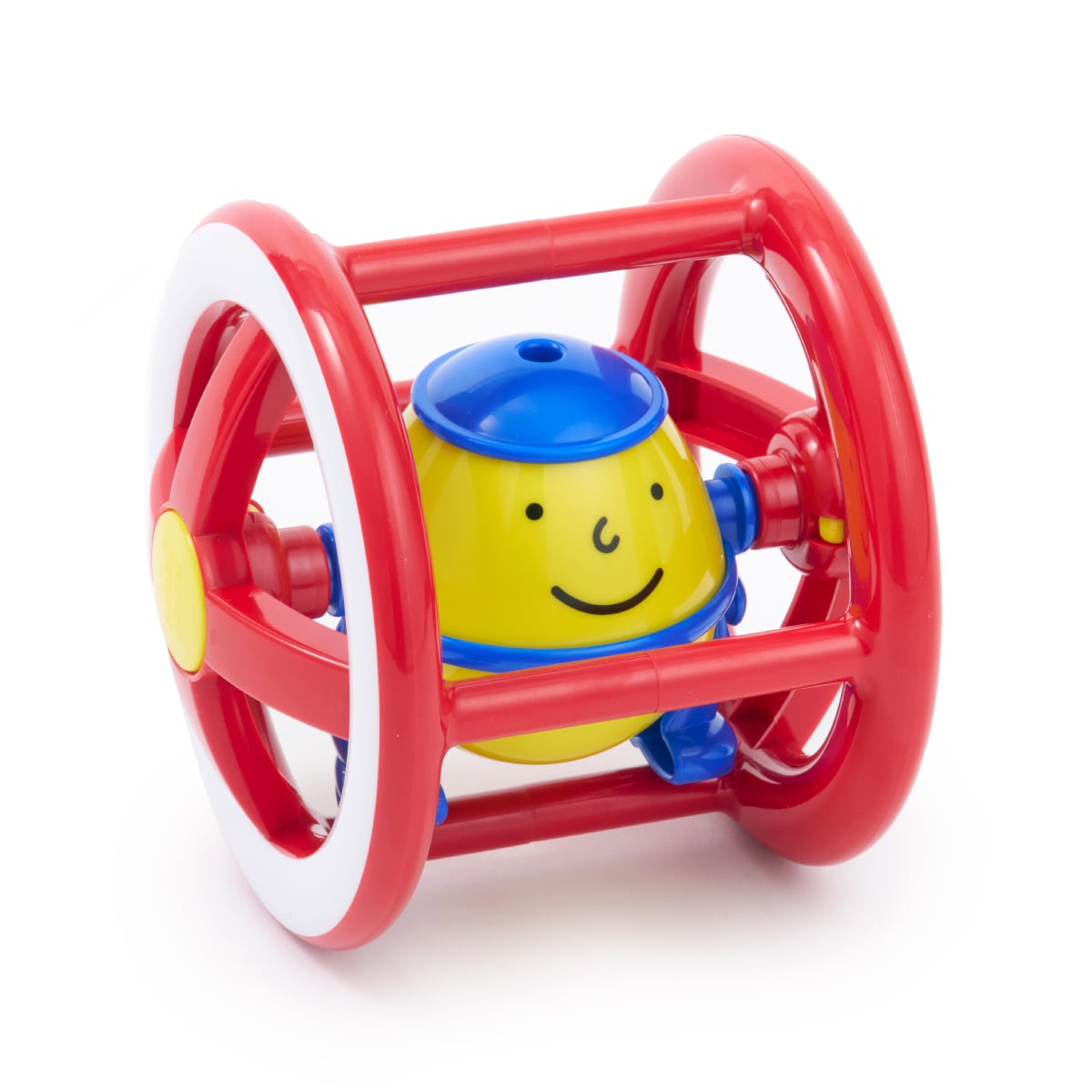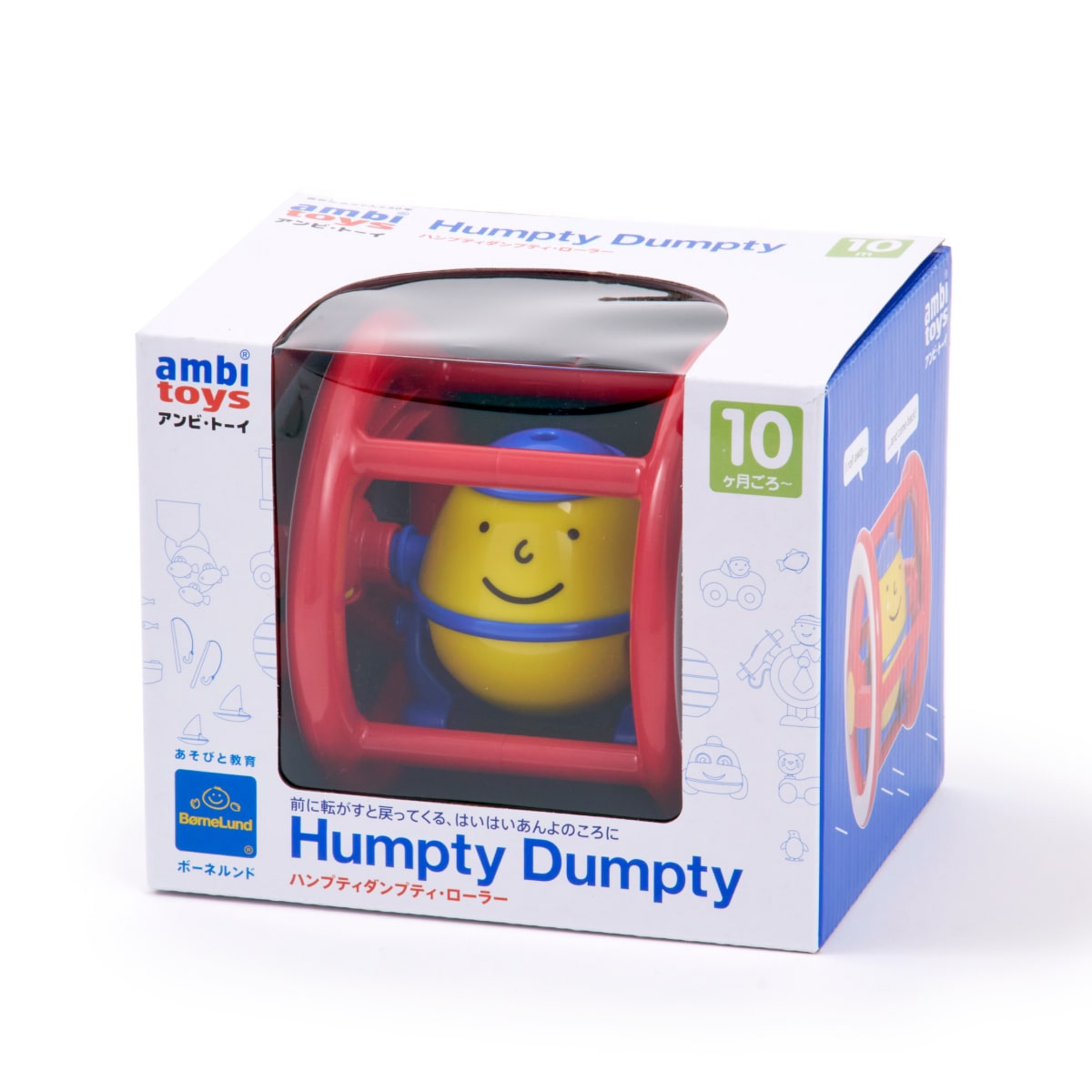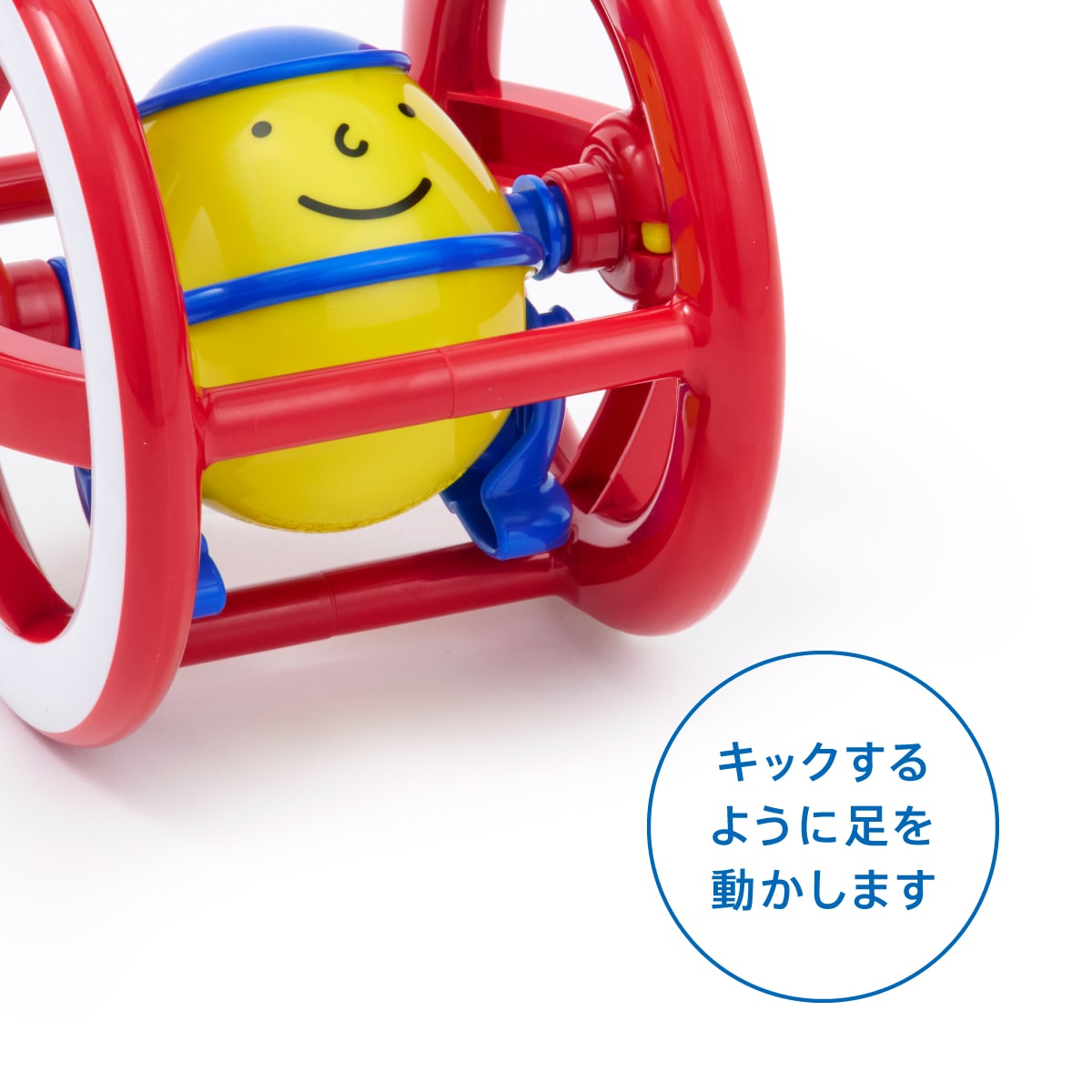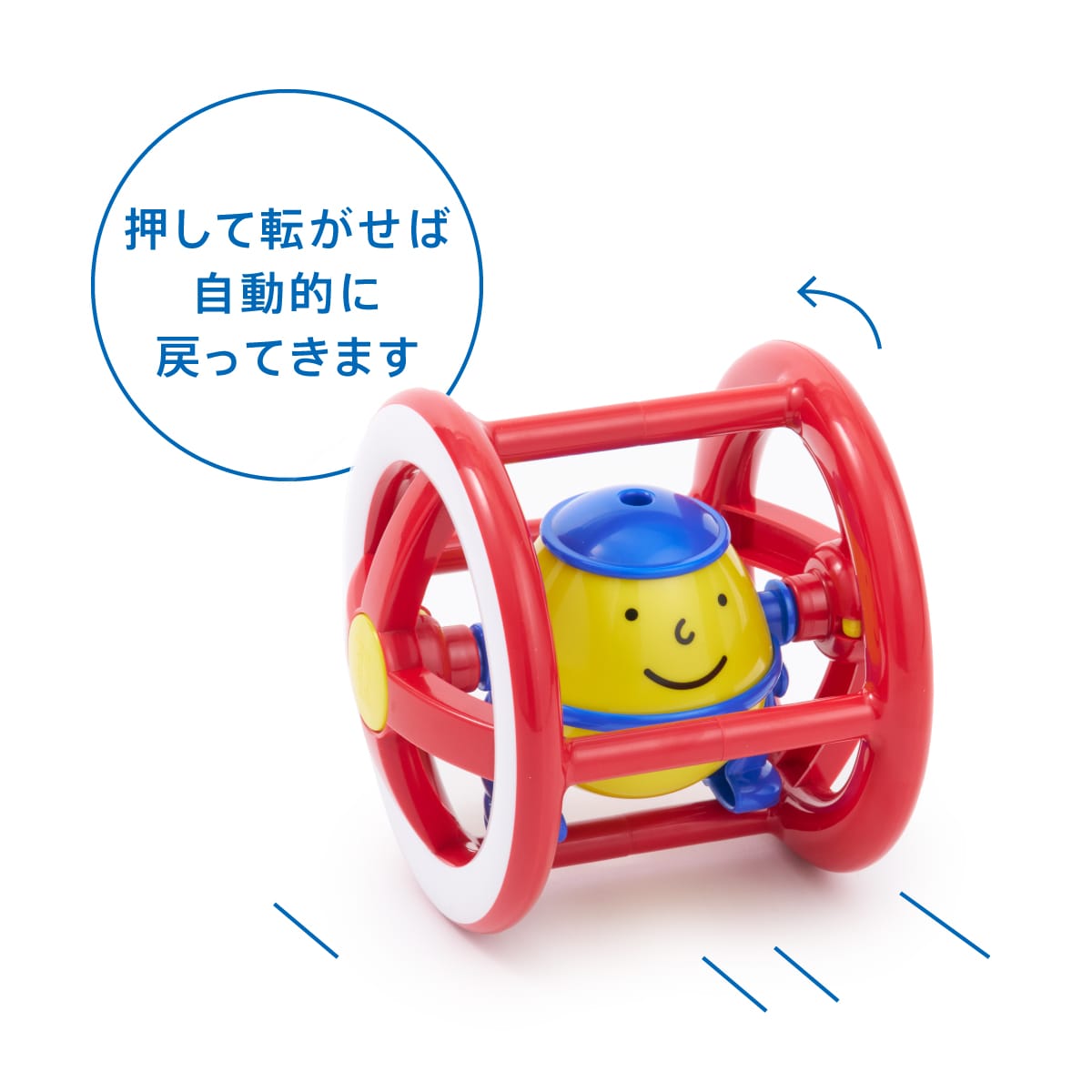 ハンプティダンプティーを前に転がすと、コロコロと赤ちゃんのもとに戻ってきます。動きのあるものを目で追い自然とからだが動くあそびは、ハイハイやあんよの頃にぴったりです。ハンプティダンプティーを運ぶ赤いローラーは赤ちゃんが握りやすいデザインです。