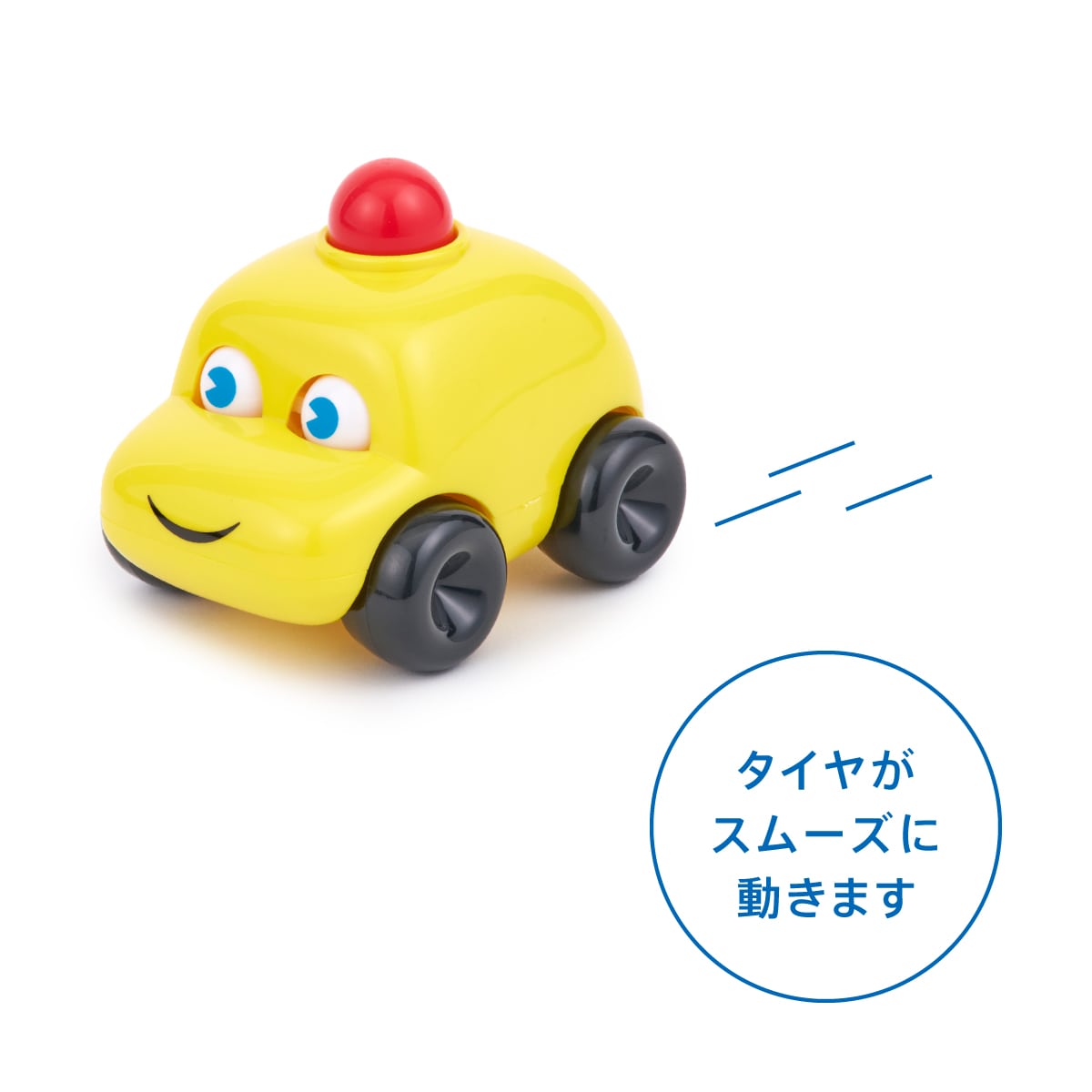 赤ちゃんは顔のモチーフが大好き。車体を動かすと目が上下にキョロキョロとユーモラスに動き、頭の赤いボタンを押せば「プップー」とクラクションが陽気に鳴る、ユニークな乗りもののあそび道具です。