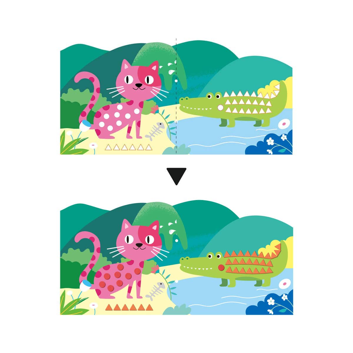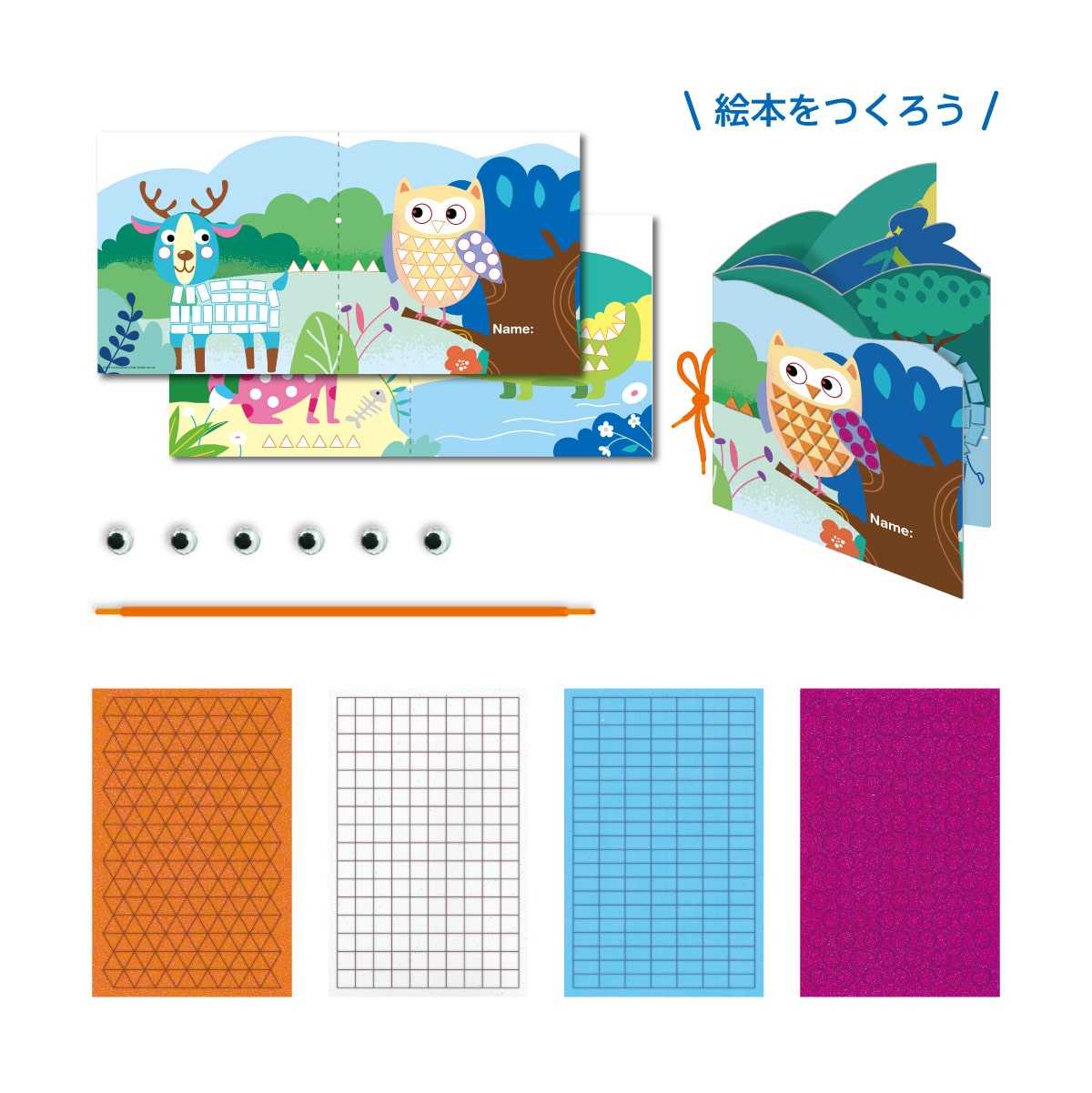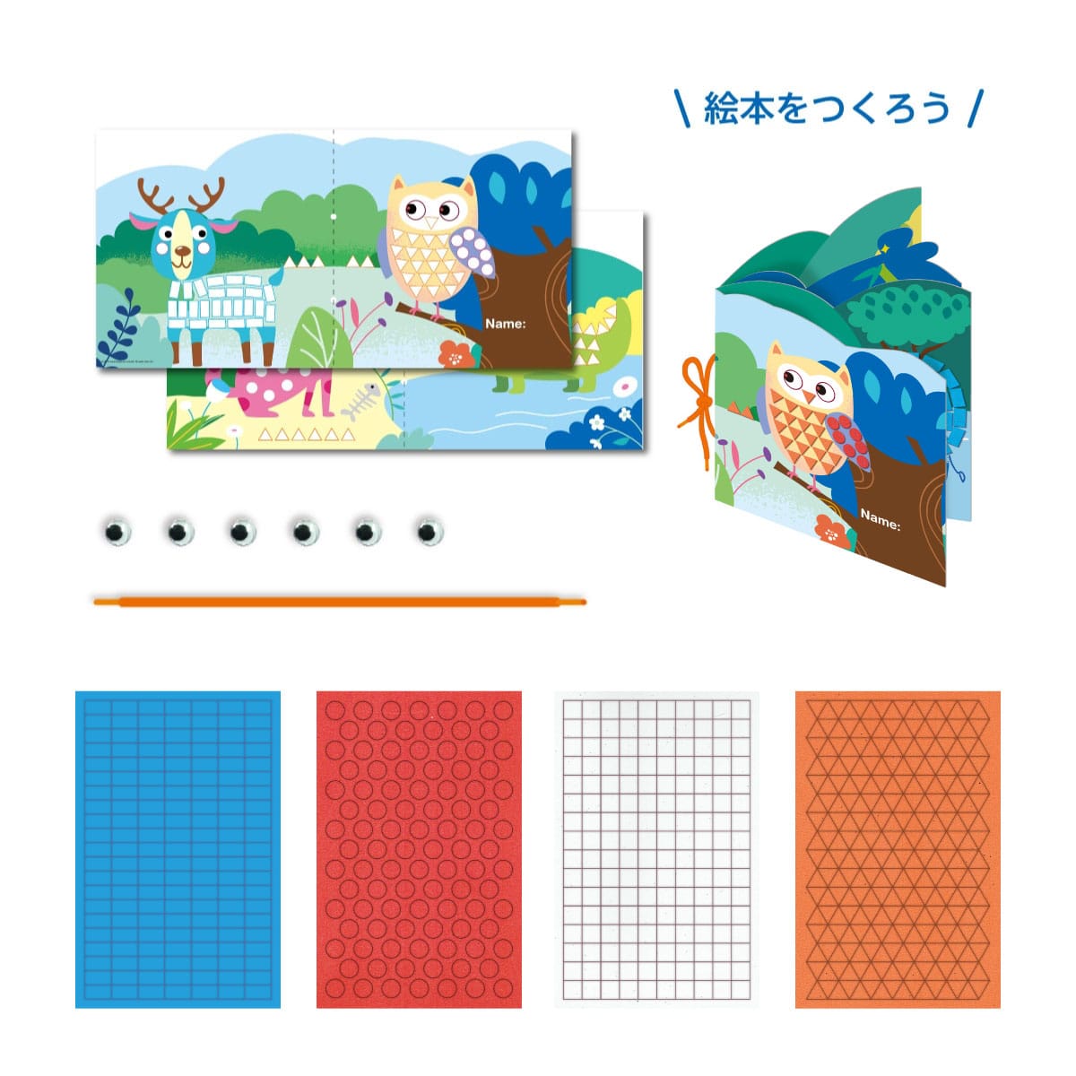 | セット内容 | 両面デザインシート×2(20x40cm)、かたちのシール×4(まる、さんかく、正方形、長方形)、目玉シール×6、綴じひも×1 |