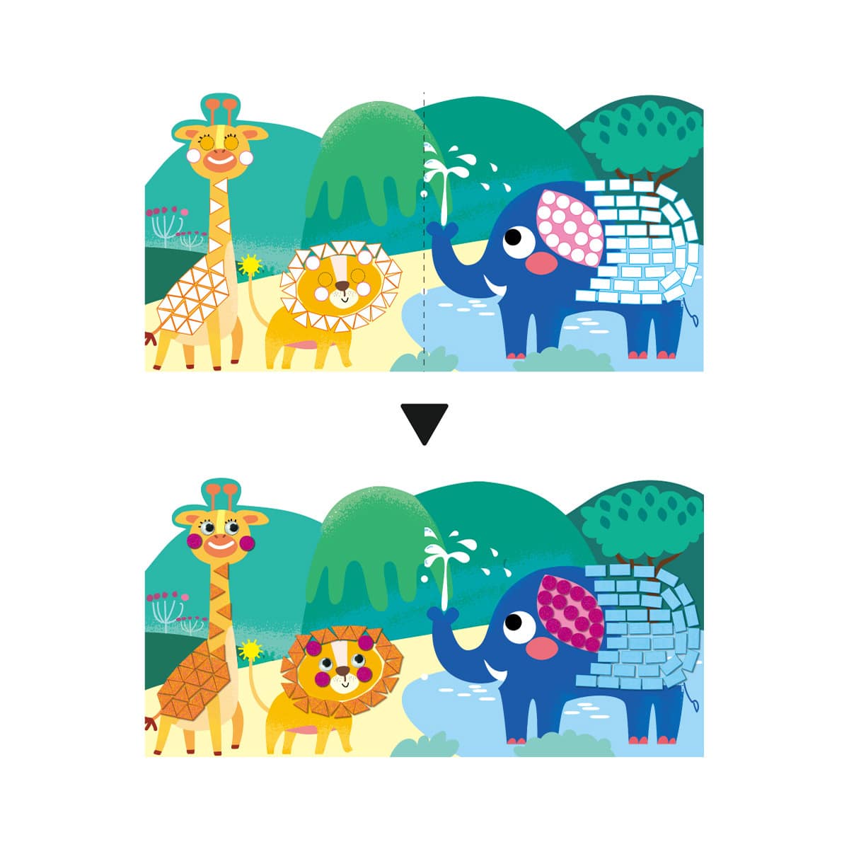 どうぶつのモチーフ。ぞうさんのお鼻の長さや好きな食べ物など、お話をしながら貼っていくのも楽しいですね。付属のひもで綴じれば、自分だけの絵本が完成。絵本や紙芝居のようにお話を作って遊べます。