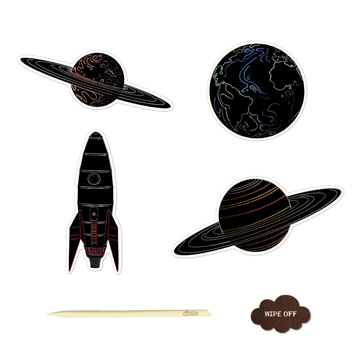 黒い部分を削ると、宇宙船や惑星のモチーフが、まるで本物のような質感の下色とともに現れるスクラッチアート。削る範囲を調整することで、思い描くリアルな宇宙の世界観を表現できる楽しさがあります。 どこまで黒い部分を削るかという選択もまた面白く、より本格的なデザインに触れたい頃にぴったりのクラフト遊びです。