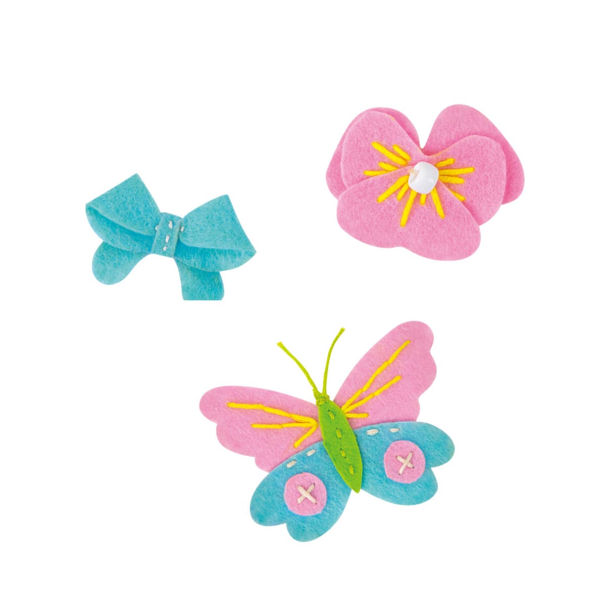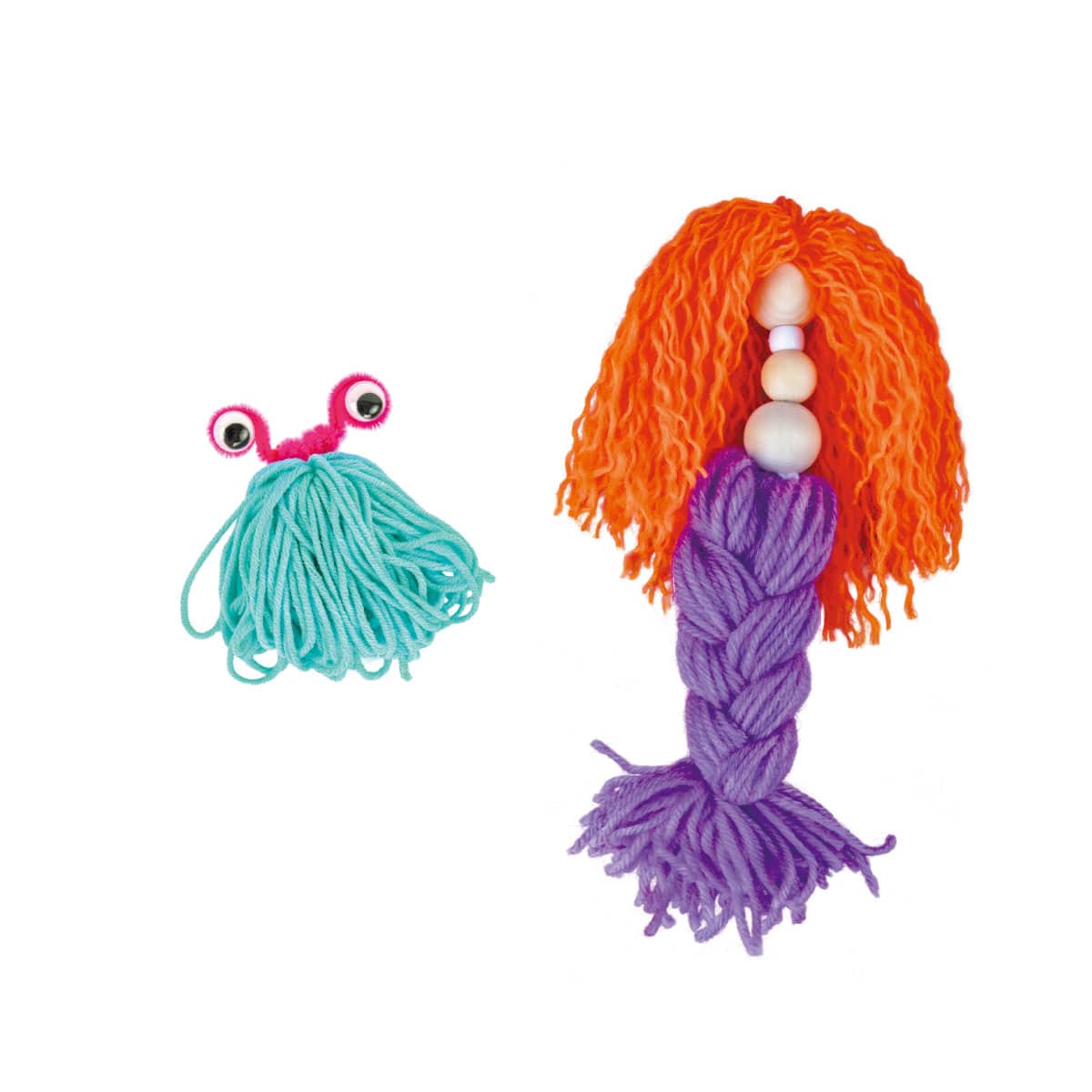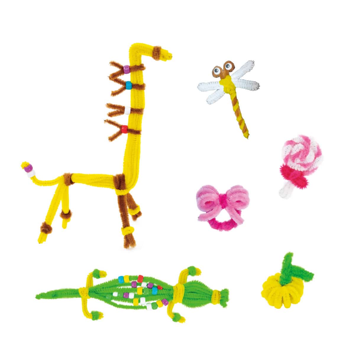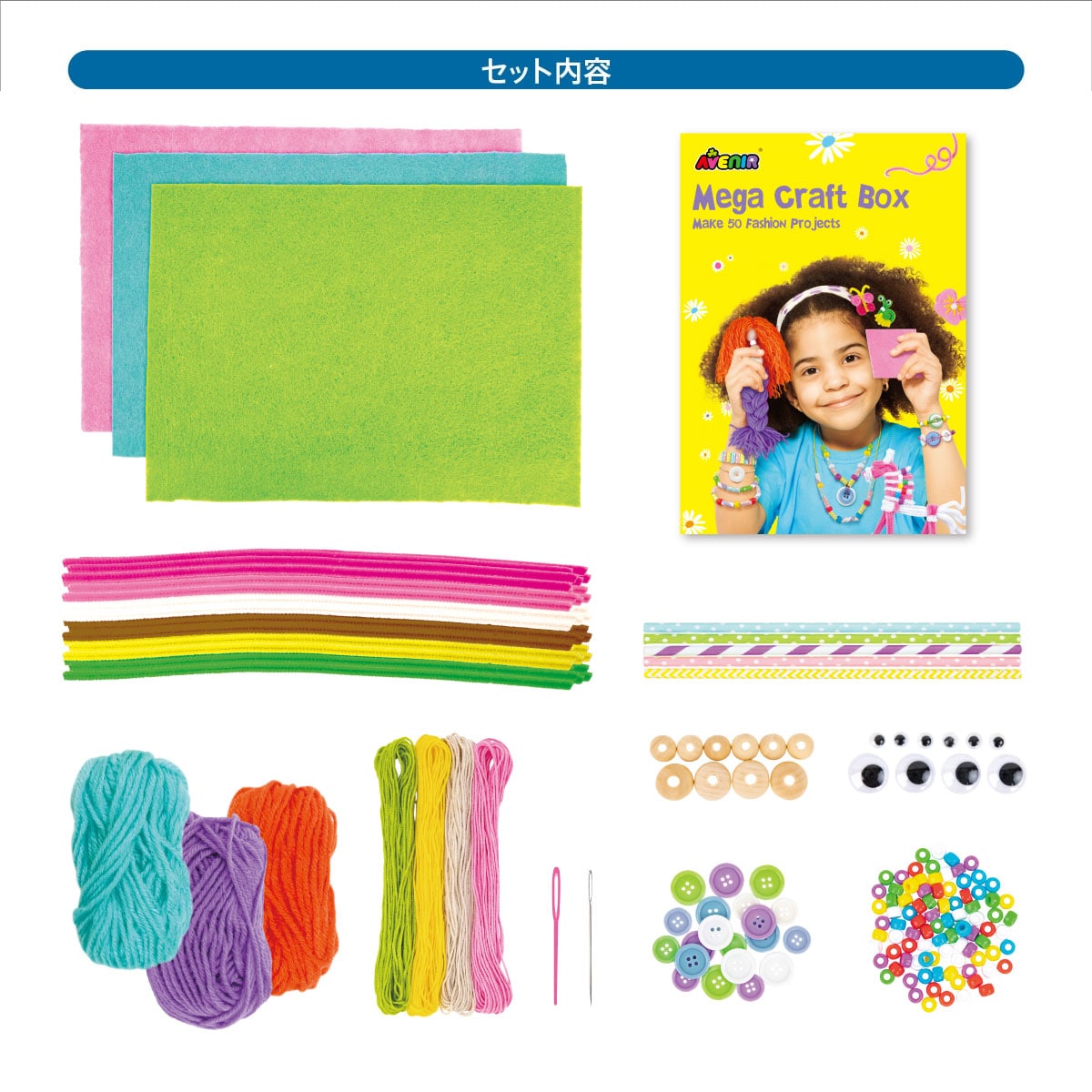 | セット内容 | カラーモール(6 色)×80本、カラーボタン(4色)x大12個、小8個、カラービーズ(6色)×80個、木製ビーズ×大4、小×6、目玉シール大×4、小×6、刺繍糸×4本、フェルト×3枚、デザインストロー×5本、毛糸玉×3個、縫い針×1、フェルト工作用の下絵×1、図説×1 |