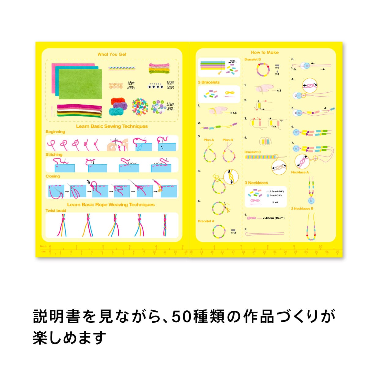 その日の気分で素材を選んで、自由に工作を楽しむのはもちろん、イラスト入りの作り方ガイドが入っていて、3種類のネックレス、13種類のブレスレット、4種の毛糸のマスコット、10種のフェルトデコレーション、20種のカラーモール工作、と計50 種類ものアクティビティが楽しめる内容になっています。それぞれ、ステップバイステップの動画も用意されているので、「作り方のガイドがあった方があそびやすい」というお子さんに向けてもおすすめです。