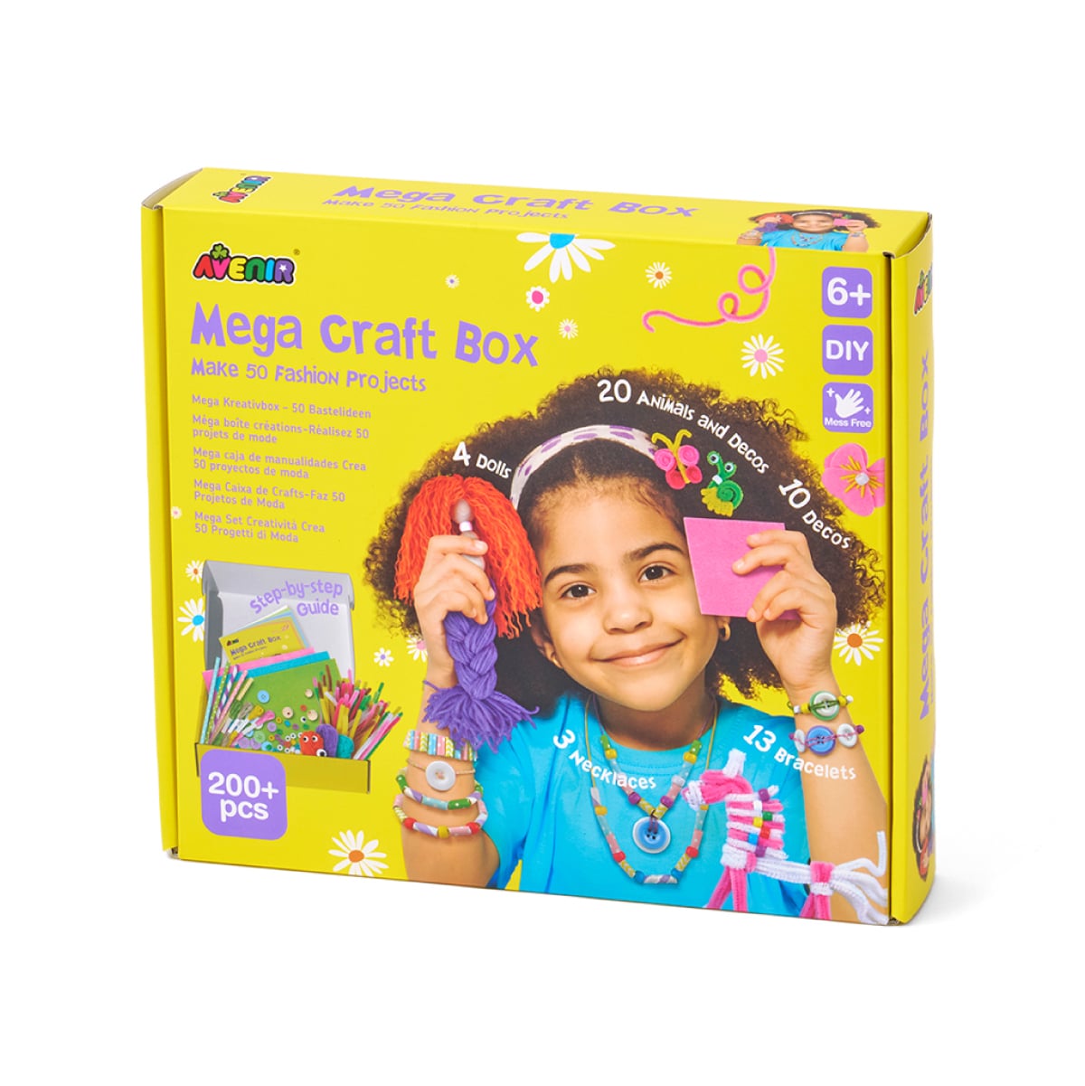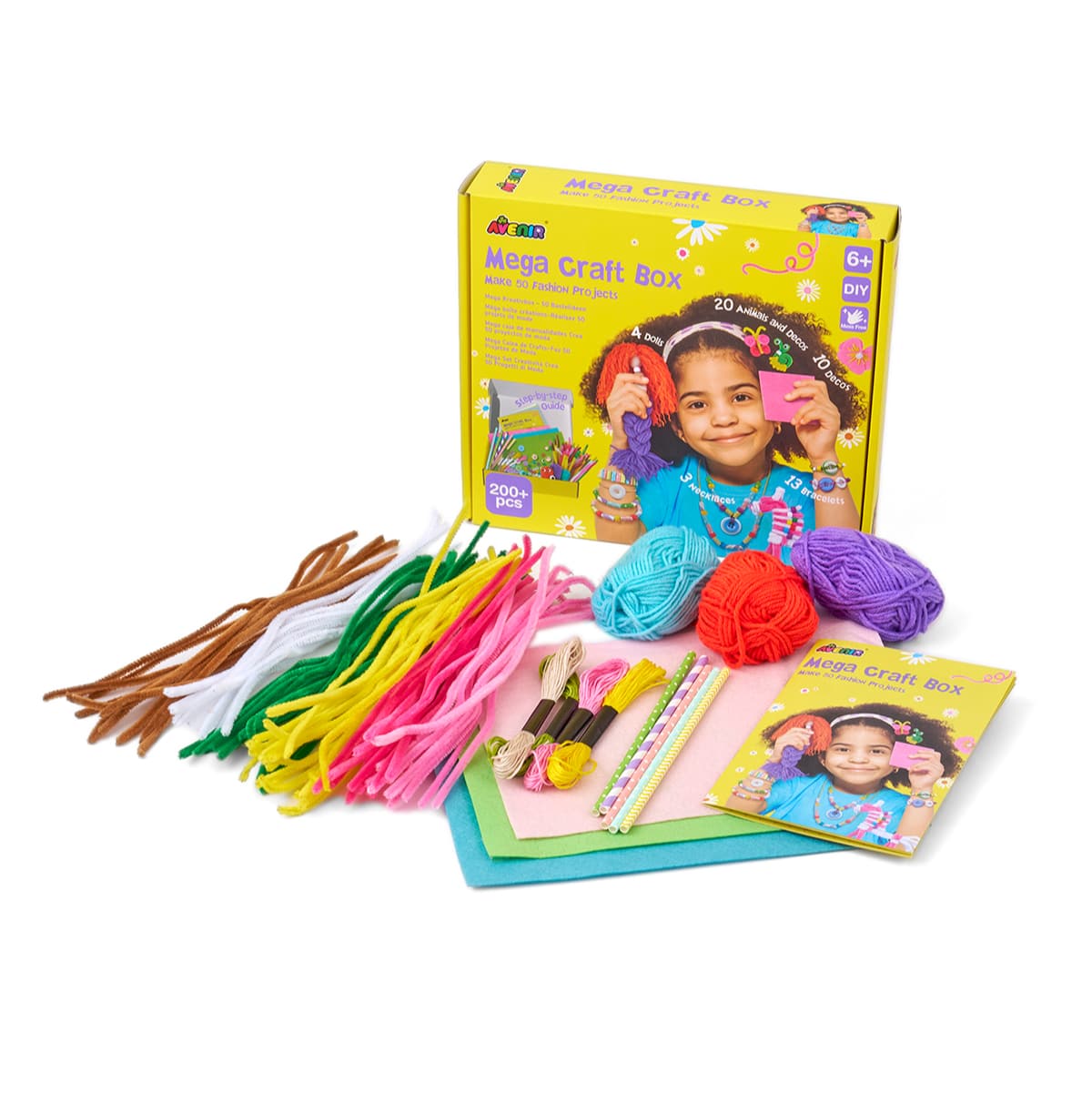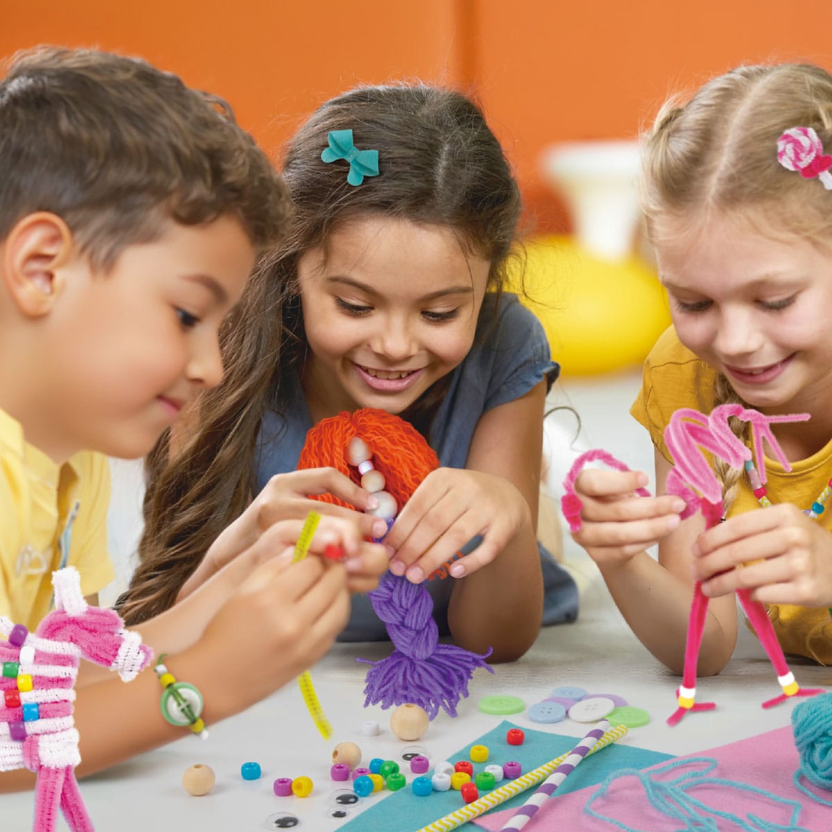 カラーモール、ビーズ、フェルト、ボタン、紙ストロー、刺繍糸、毛糸玉など、バリエーション豊かな工作素材がたっぷり入ったクラフトBOX です。