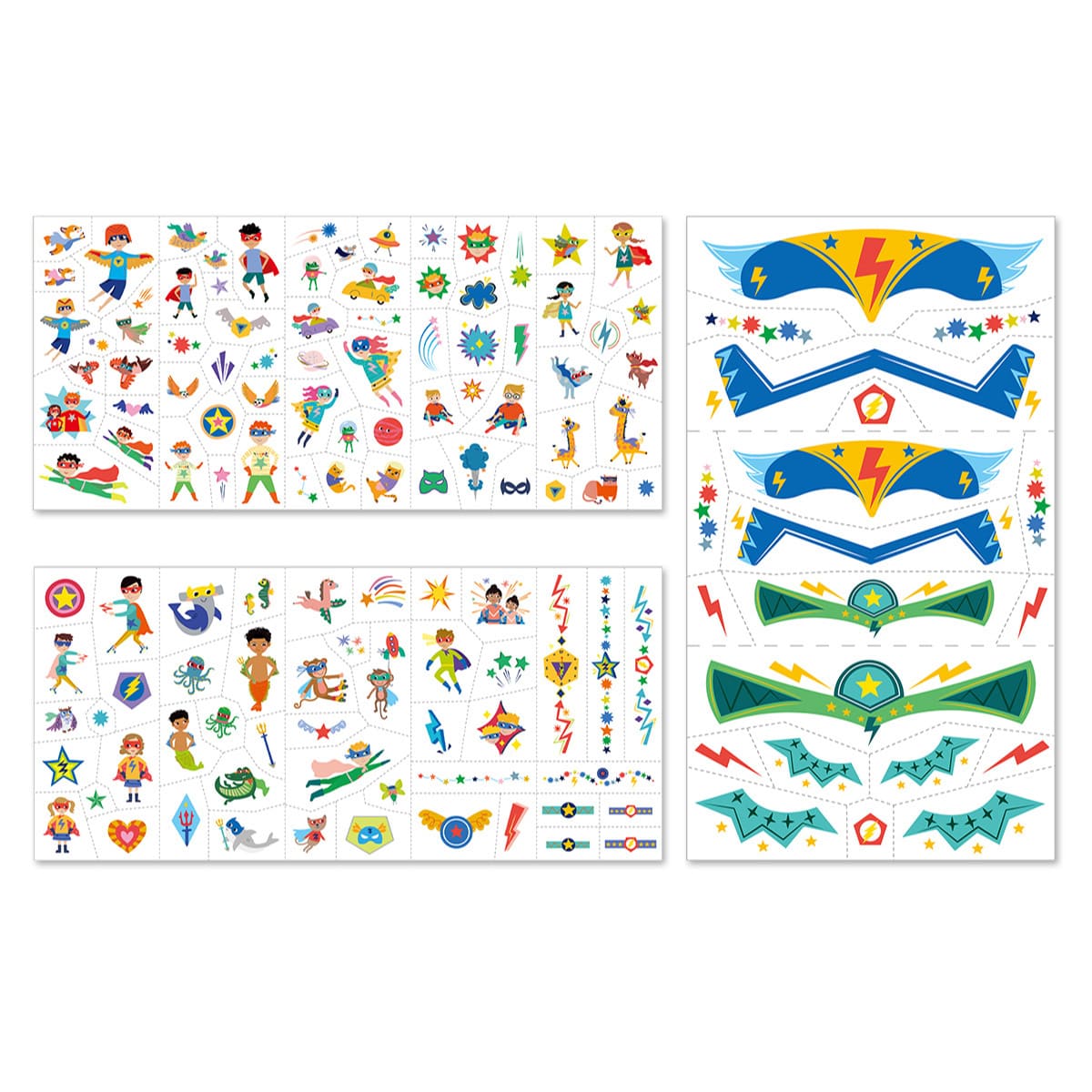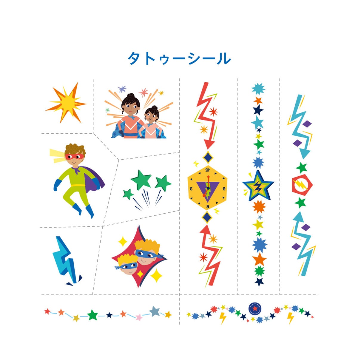タトゥーシールが2シート(117個)、フェイスシールが1シート(20個)、と計137個入り。今日はどれにしよう?と組み合わせを楽しみながら使えます。身に付けると元気が出たり気持ちが強くなる、スーパーヒーロー・スーパーガールになれるモチーフ。パパと一緒に使うのもおすすめ。