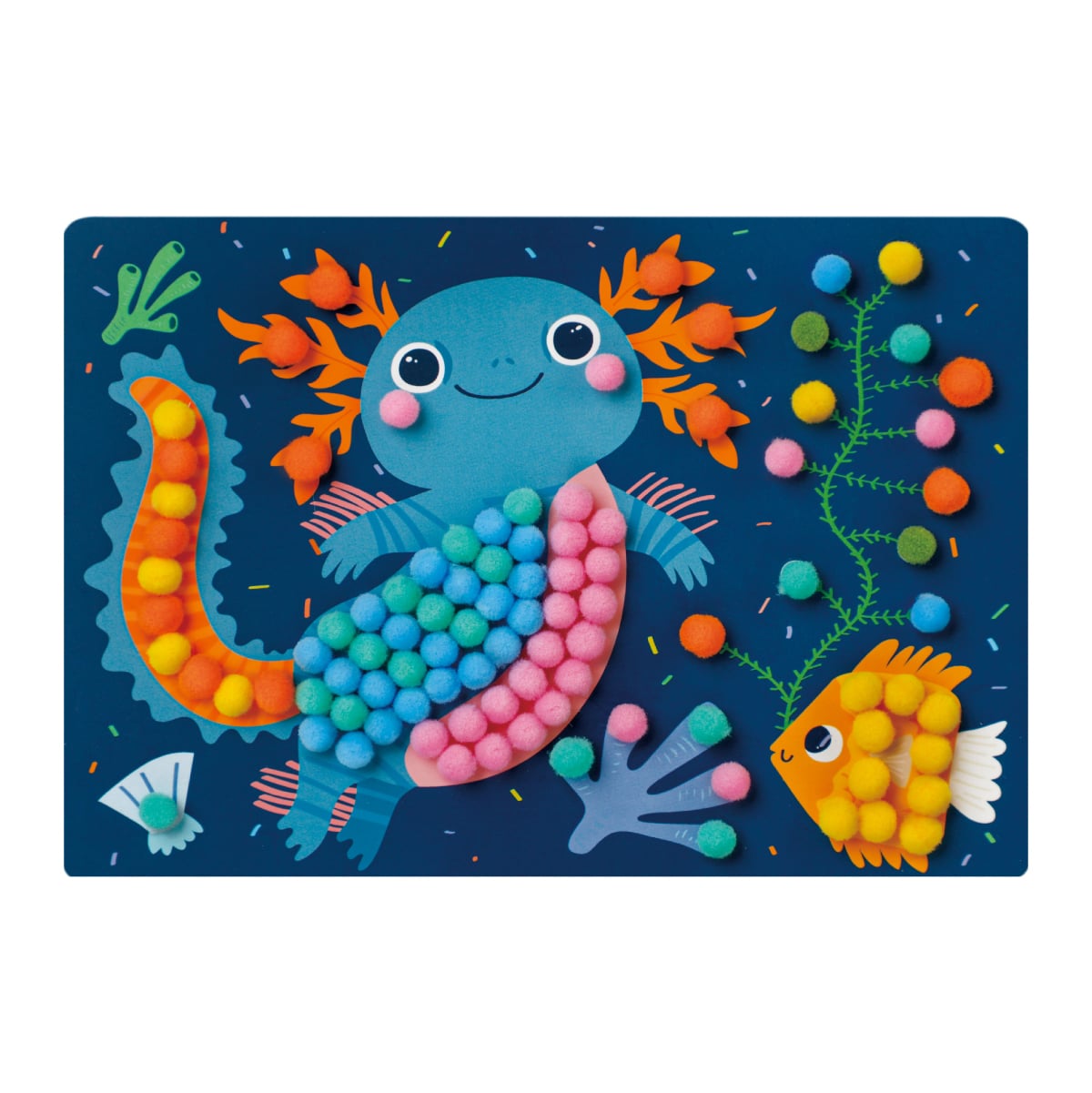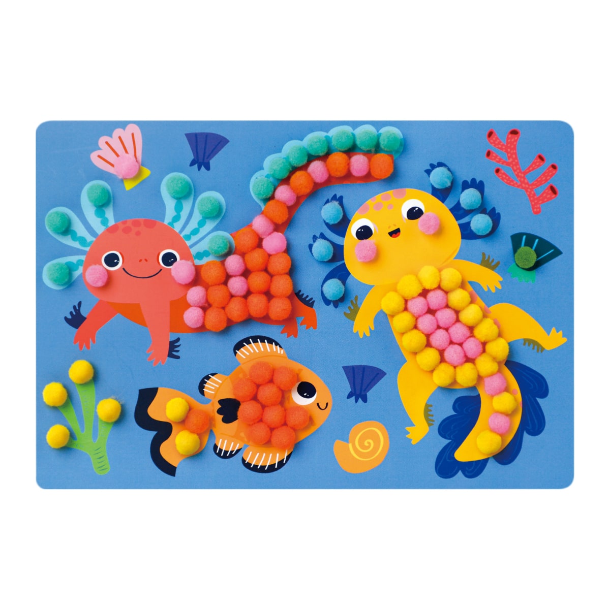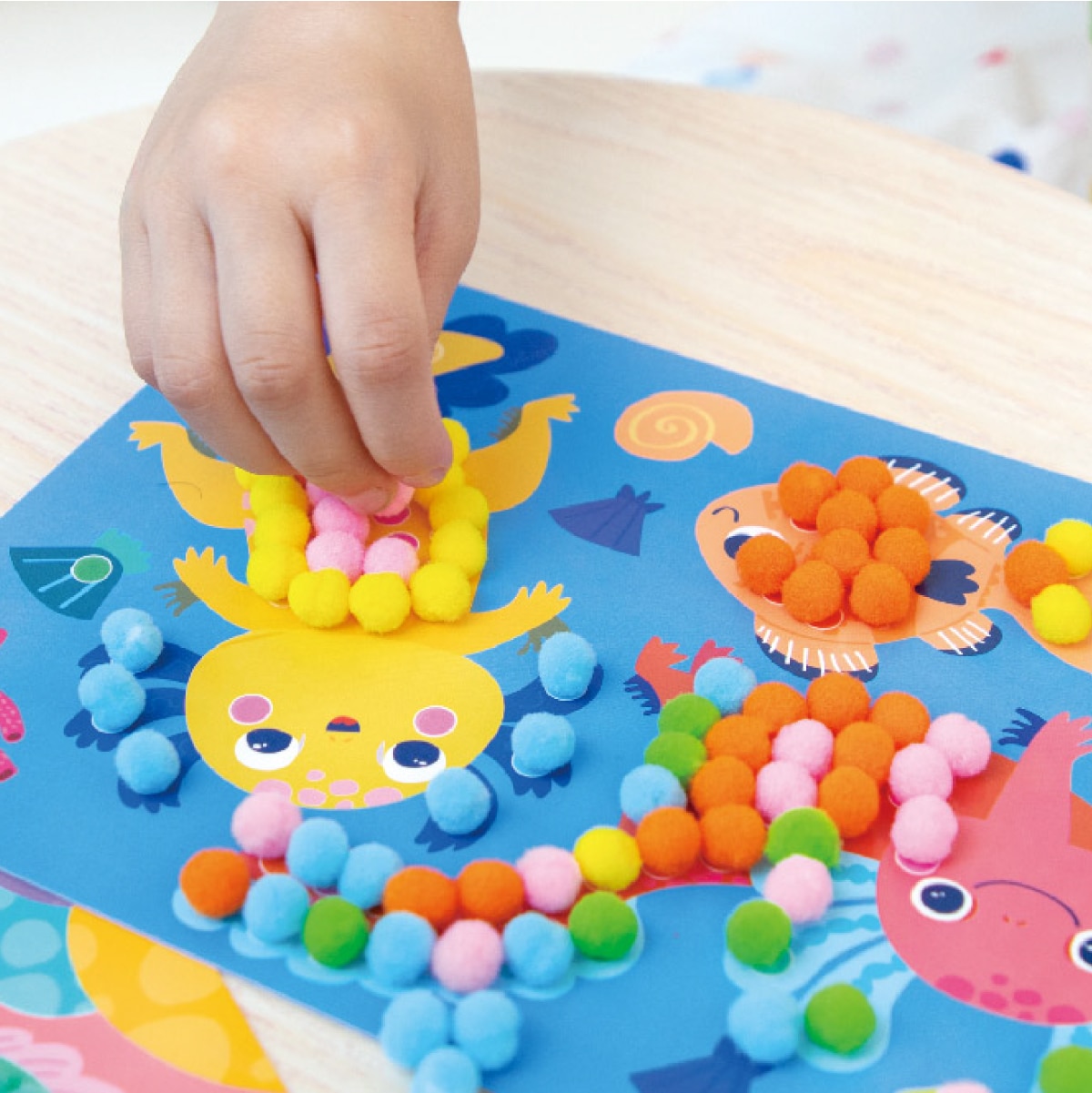 カラフルなイラストシートの粘着仕様になっているドットの箇所に、5mm程度のポンポンを貼り付けて完成させる半立体アート。道具を介さない、素材と素材を指先でくっつける作品づくりは、失敗がなく3歳ごろの子どもが安心して取り組める難易度です。工作とお絵かきのハイブリッドのような完成品は、固さと厚みのあるシートで、飾るのにもぴったりです。