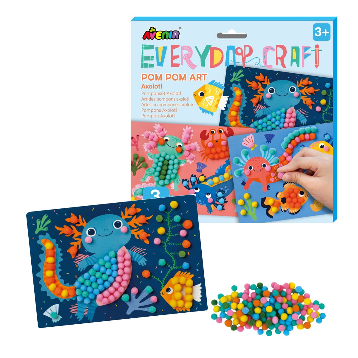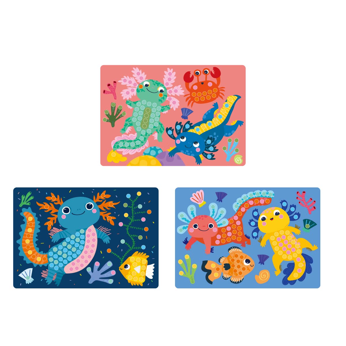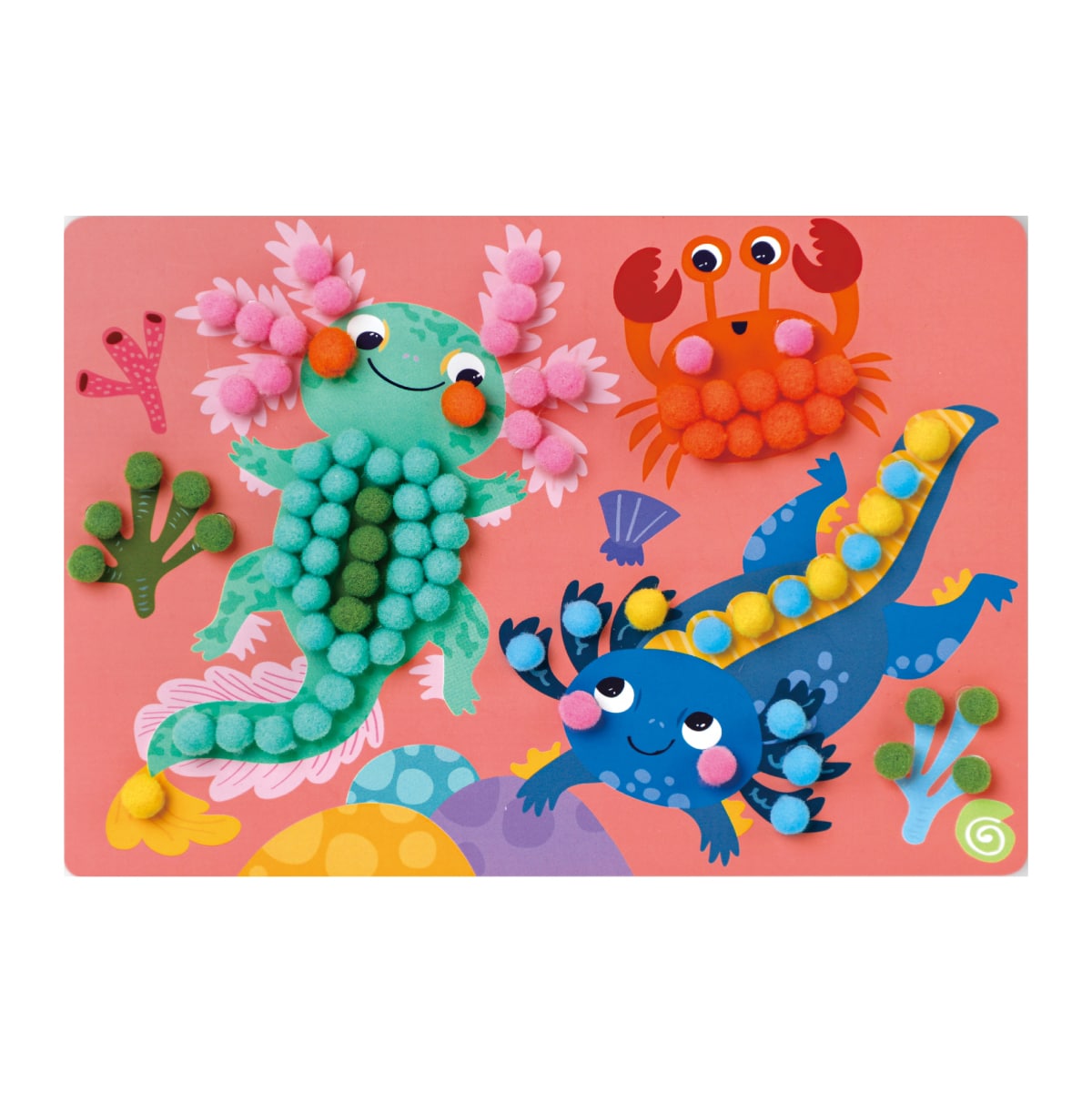 カラフルなイラストシートの粘着仕様になっているドットの箇所に、5mm程度のポンポンを貼り付けて完成させる半立体アート。道具を介さない、素材と素材を指先でくっつける作品づくりは、失敗がなく3歳ごろの子どもが安心して取り組める難易度です。工作とお絵かきのハイブリッドのような完成品は、固さと厚みのあるシートで、飾るのにもぴったりです。