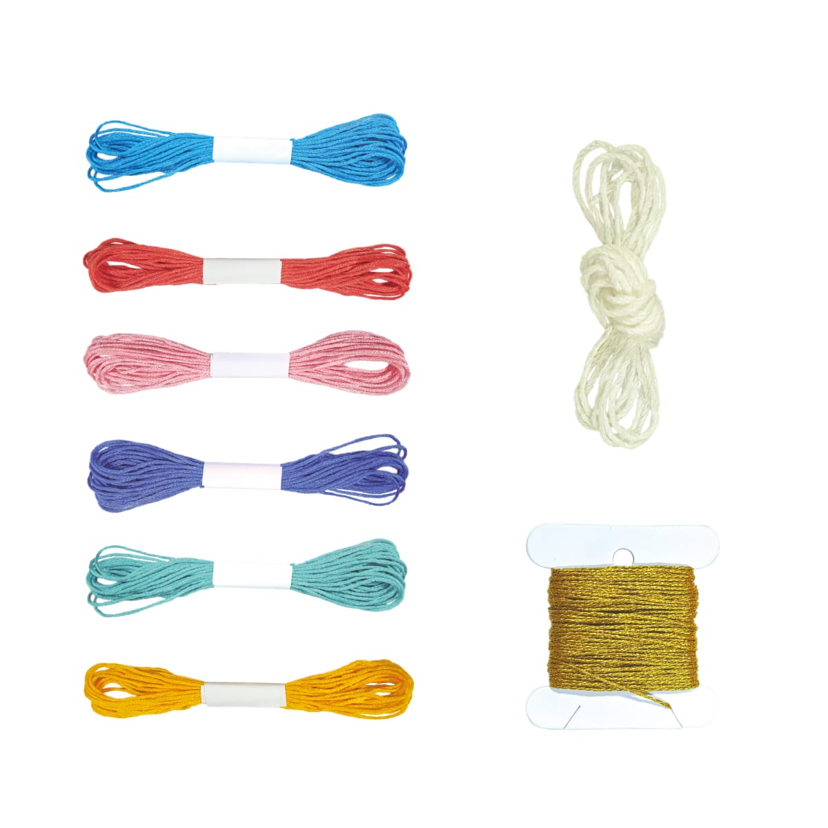 | セット内容 | 刺繍糸×6色、毛糸×1色、メタリックコード×1色、組みひもディスク、木製チャーム×5、丸カン×12、やすり |