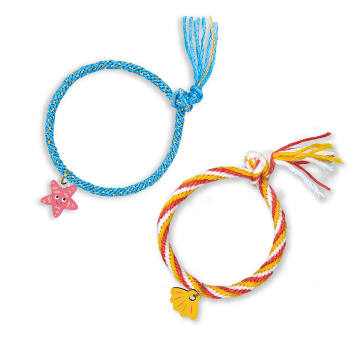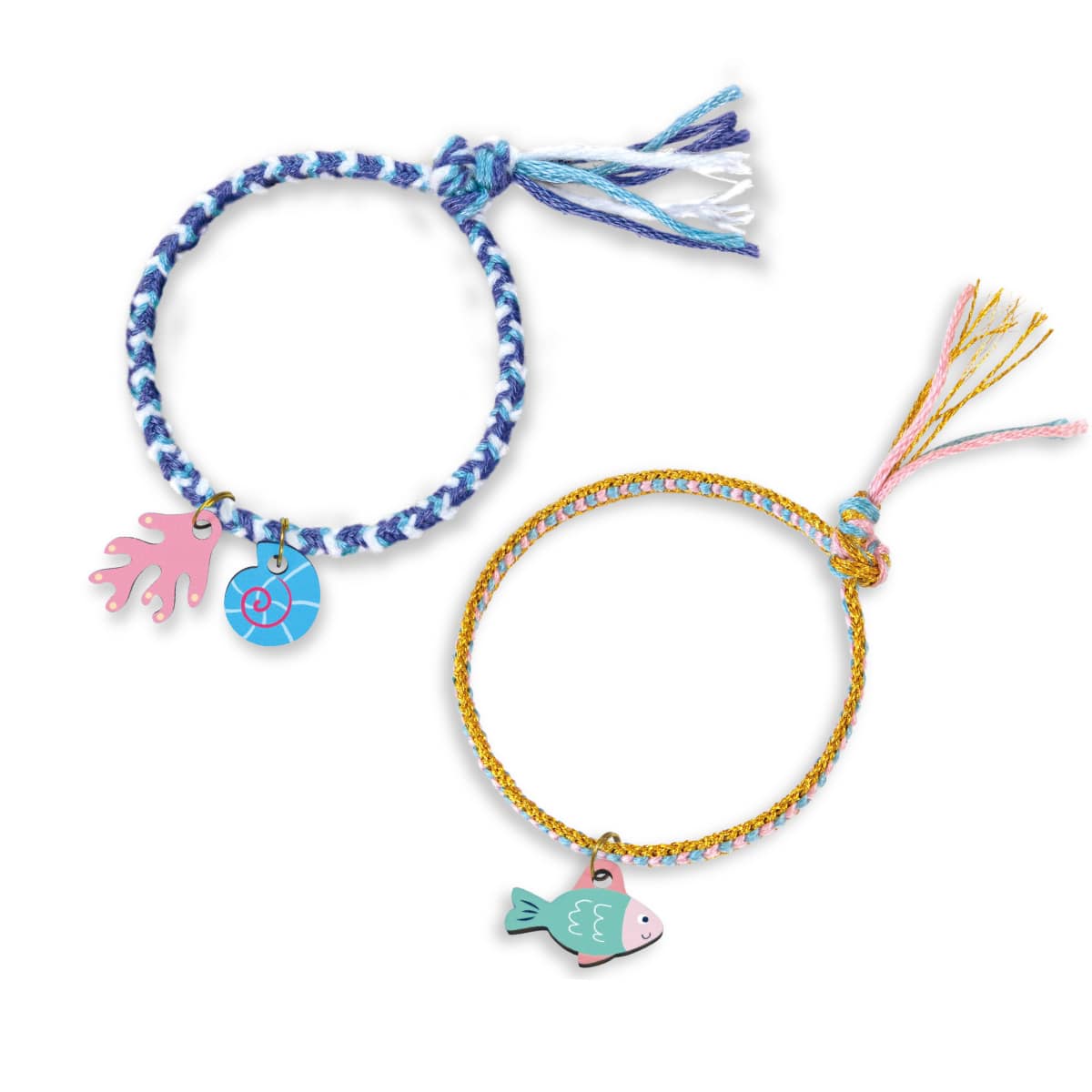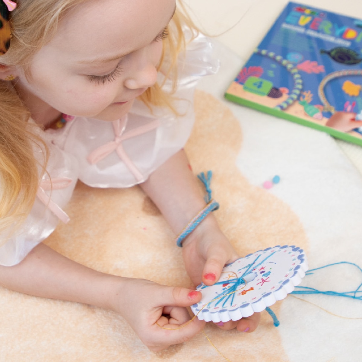 刺繍糸をボードにセットして、所定の位置に糸を動かすことで出来上がる組みひもブレスレット。海の生き物の木製チャームが付いていたり、蓄光の糸や金糸を使うことで高年齢の女の子が身につけたくなるデザインです。使う糸の数や組み方を変えることで、編地の異なるブレスレットが出来上がるのが不思議。コツを掴めば繰り返しでできるため、夕方のひとときなどに没頭して楽しめます。完成したものは自分で重ね付けしても、お友だちにプレゼントしても。