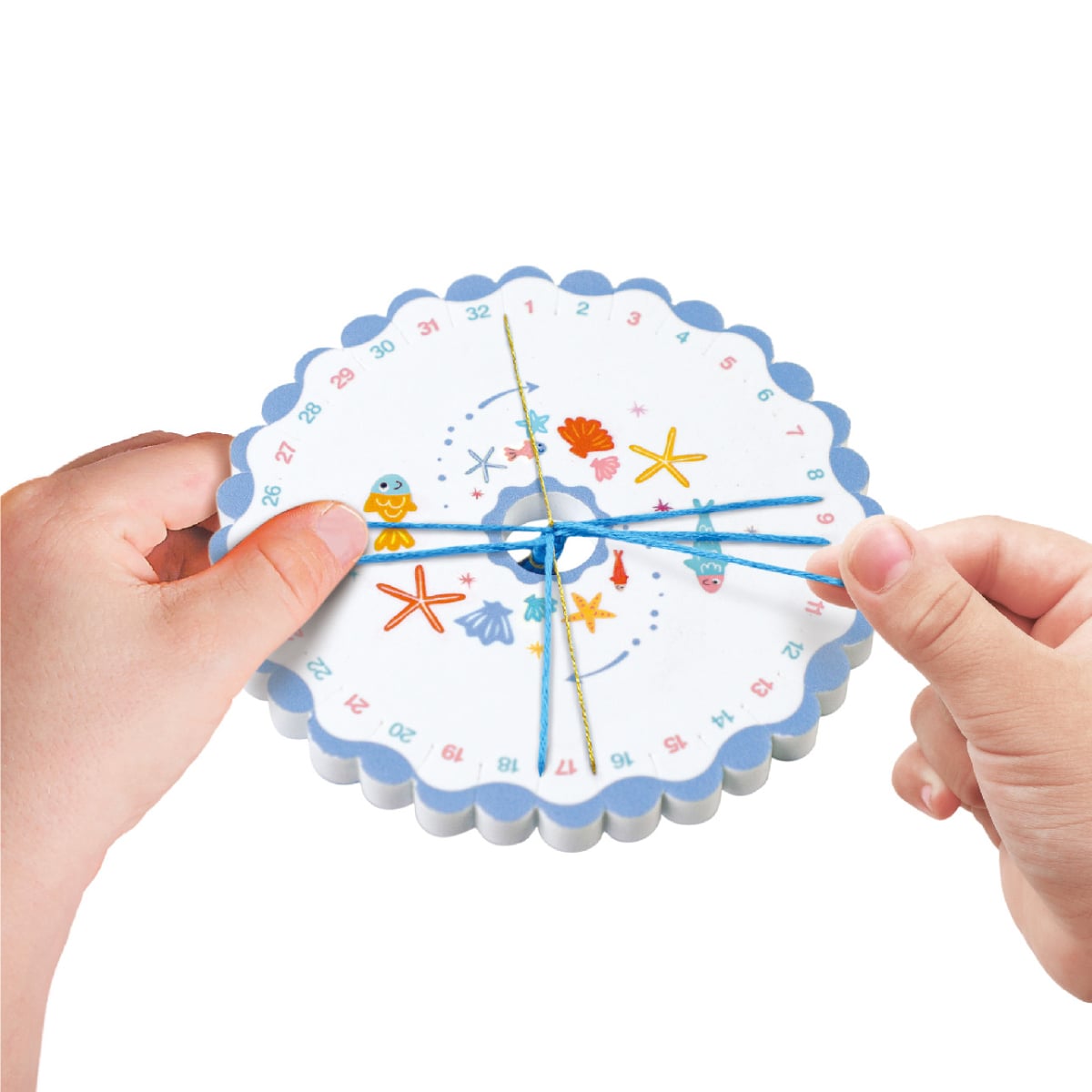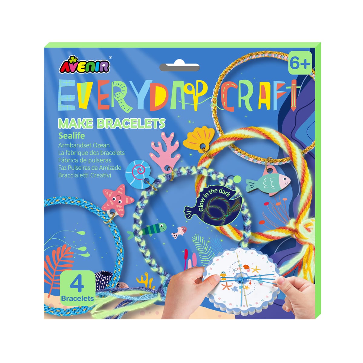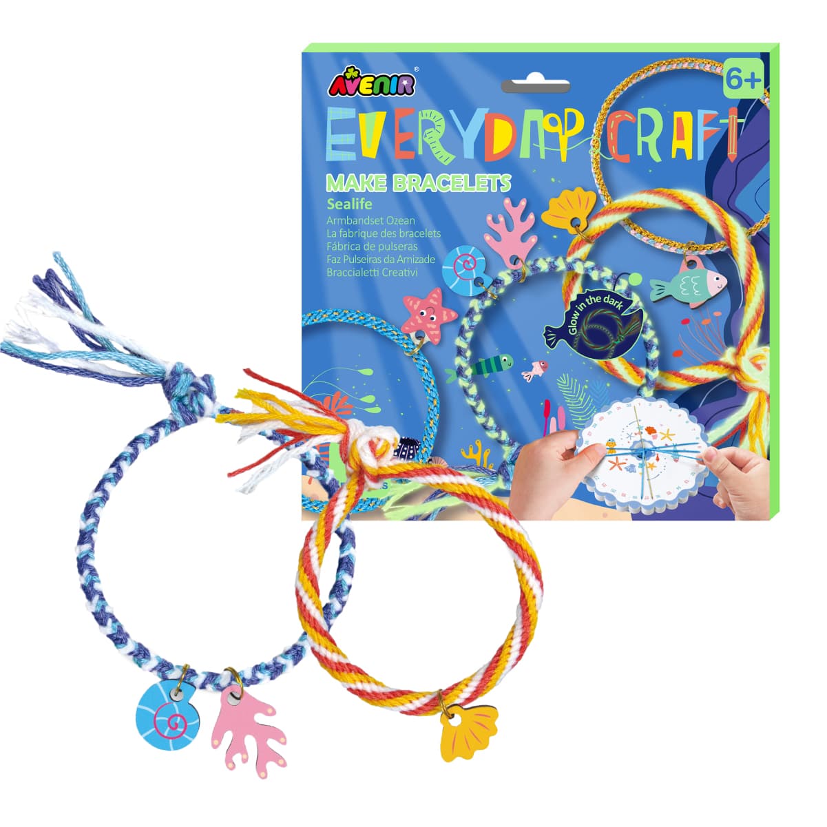 刺繍糸をボードにセットして、所定の位置に糸を動かすことで出来上がる組みひもブレスレット。海の生き物の木製チャームが付いていたり、蓄光の糸や金糸を使うことで高年齢の女の子が身につけたくなるデザインです。使う糸の数や組み方を変えることで、編地の異なるブレスレットが出来上がるのが不思議。コツを掴めば繰り返しでできるため、夕方のひとときなどに没頭して楽しめます。完成したものは自分で重ね付けしても、お友だちにプレゼントしても。