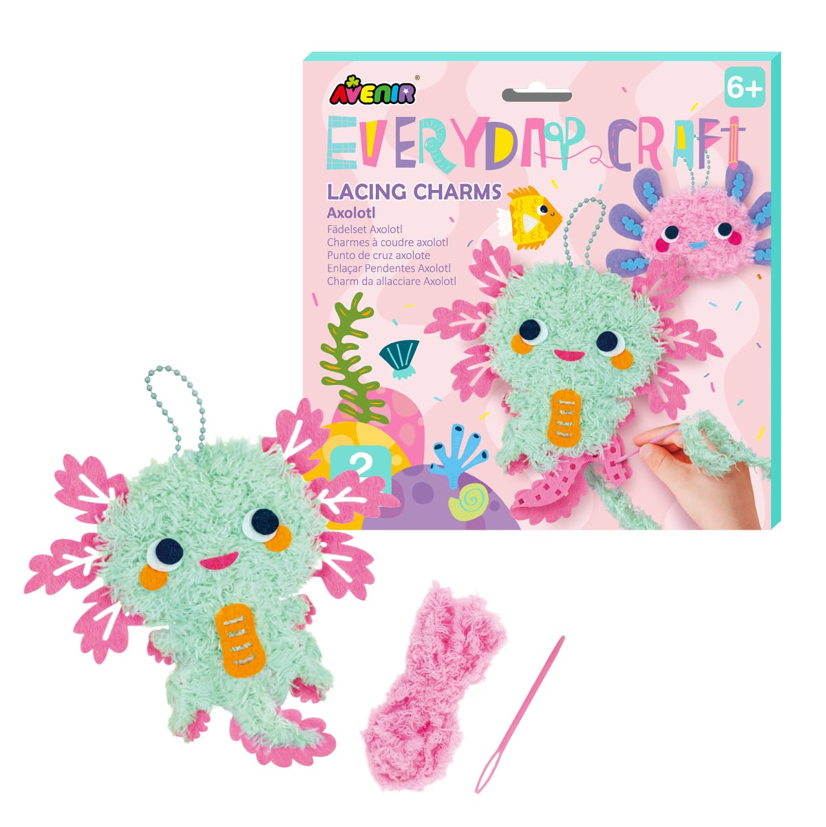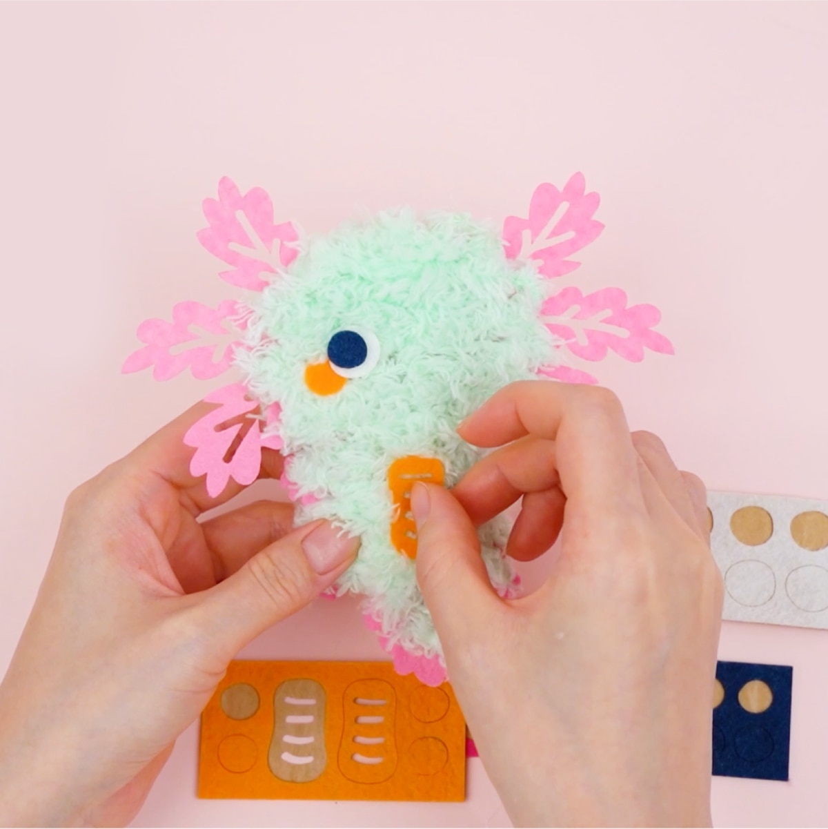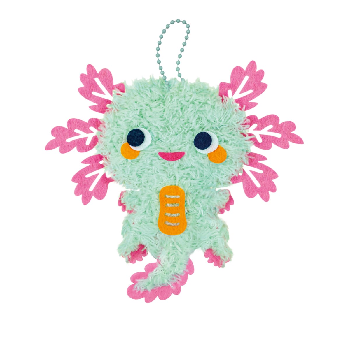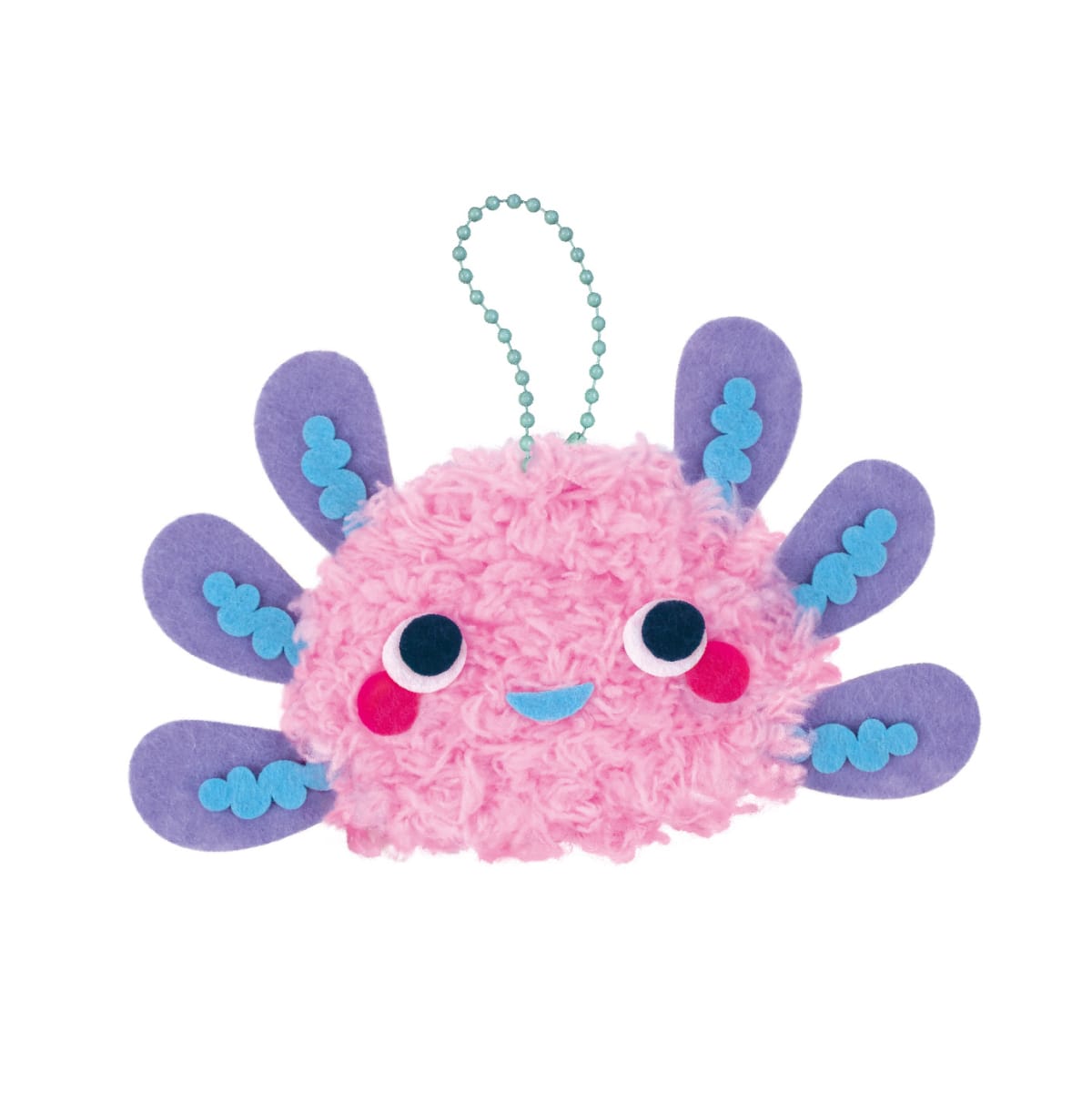 下穴のあいたフェルトにふわふわの毛糸をわたすだけで、ウーパールーパーのキーホルダーが完成!今話題のバッグチャームのような、愛らしい質感とボリュームの作品が簡単に作れます。工程はプラスチックの安全な針を使った、ひもとおし感覚の進め方で、はじめてのソーイング体験にも。ミントグリーンの全身デザインと、ピンクのお顔デザインの2つが完成するので、1つはお友だちや家族にプレゼントしてお揃いでつけることもできます。