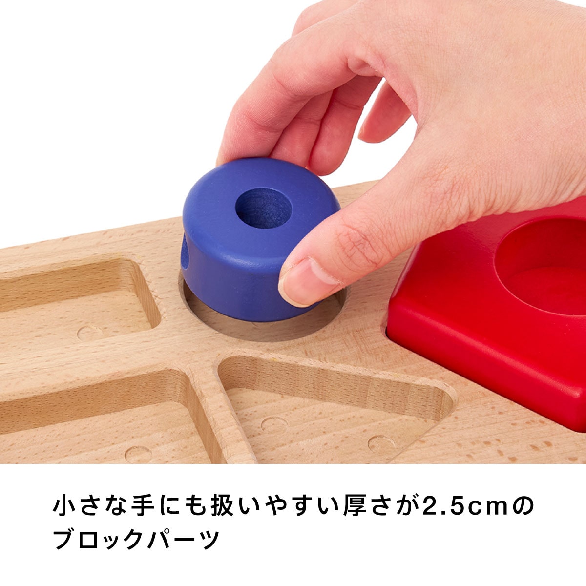 ブロックは、一番小さいサイズでも直径4.5cm、厚さは2.5cmと大きく、積み木を握るような感覚で、型から取り出したり、はめたりとかたちあわせが楽しめます。