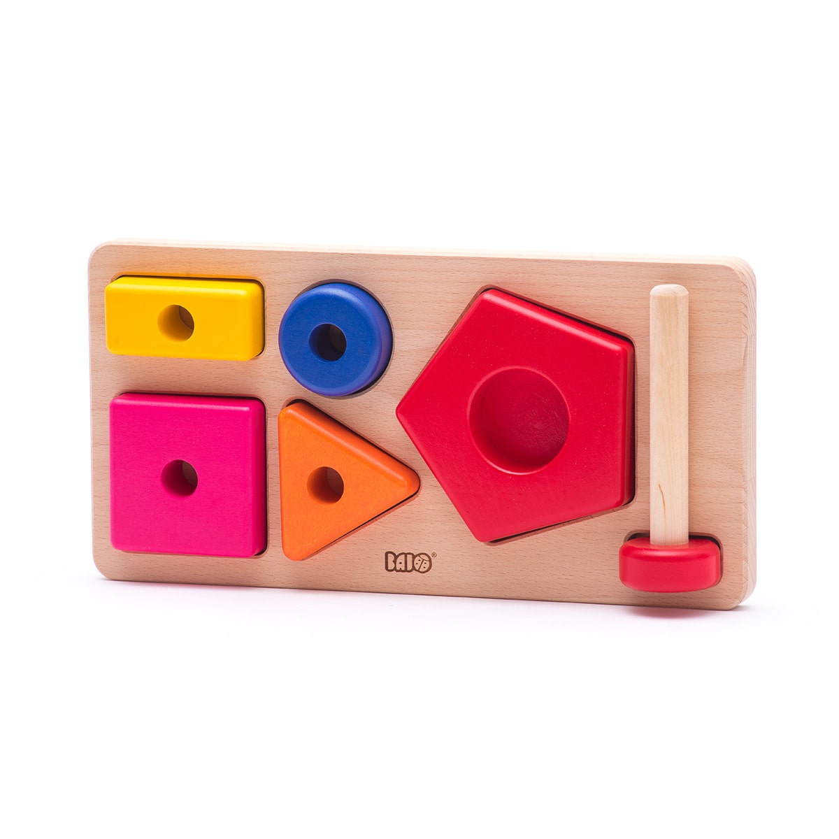 はじめに覚える「〜5まで」をもとに、形の種類は「丸」「三角形」「四角形」「五角形」の4種類で構成されています。土台の穴にはサイコロの目のように「〇角形」の数が刻まれていて、形あそびをとおして、数の感覚へと自然に広がるように工夫されています。