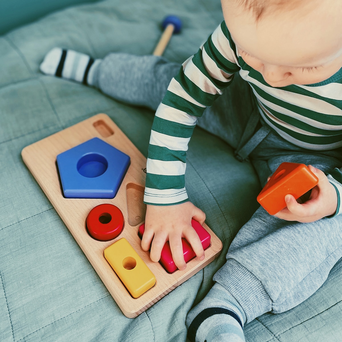 型はめとスタッキングの機能が揃っていて、色合いやデザインも安っぽくないので気に入っています。一歳の子どもはまだ上手には遊べないけど、親が「こうやるんだよ」と見せてあげています。いつか上手にできる日が来るのが楽しみです。