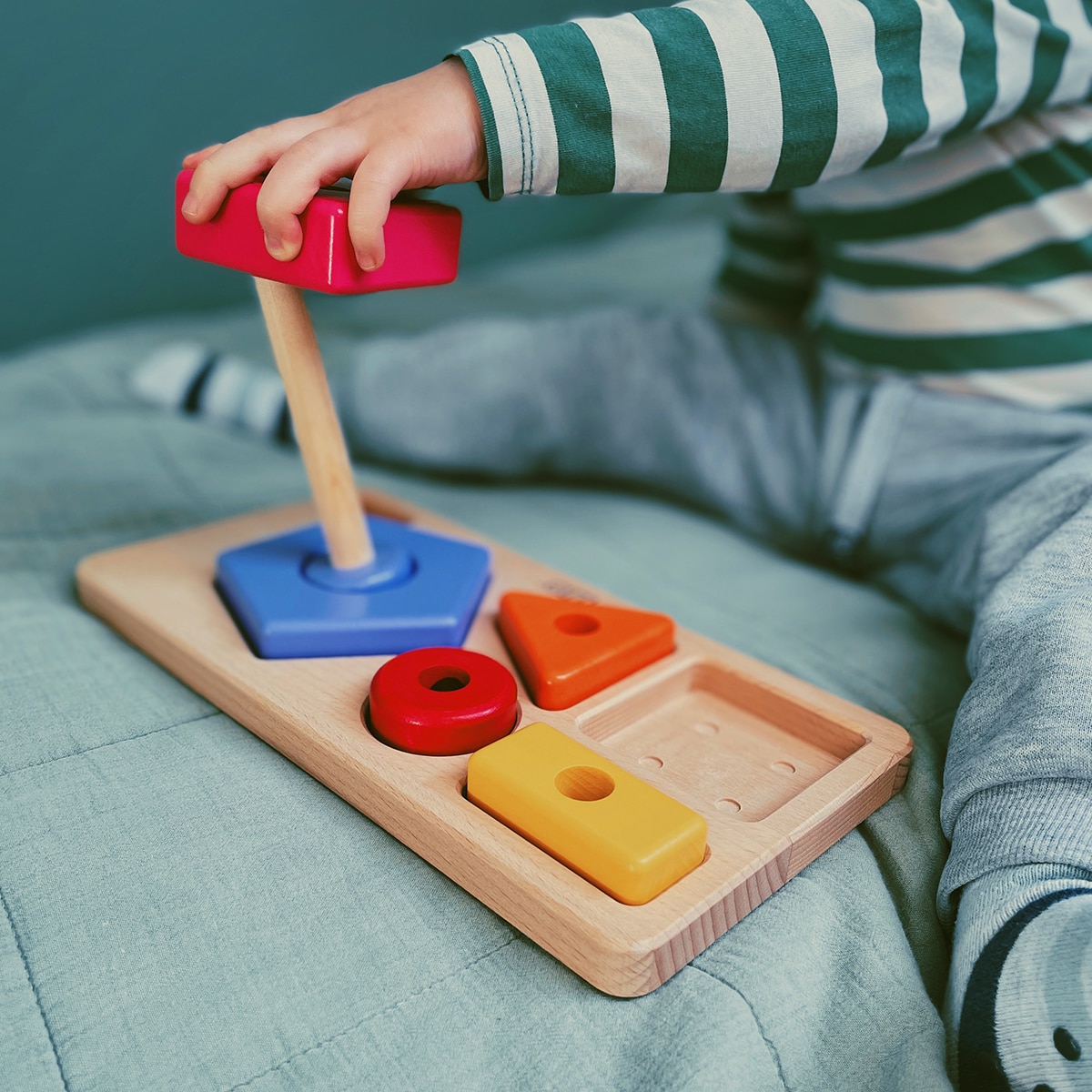 1歳頃に興味が広がる指先遊び、形遊び、色遊びが成長に合わせて楽しめる木製パズルです。
