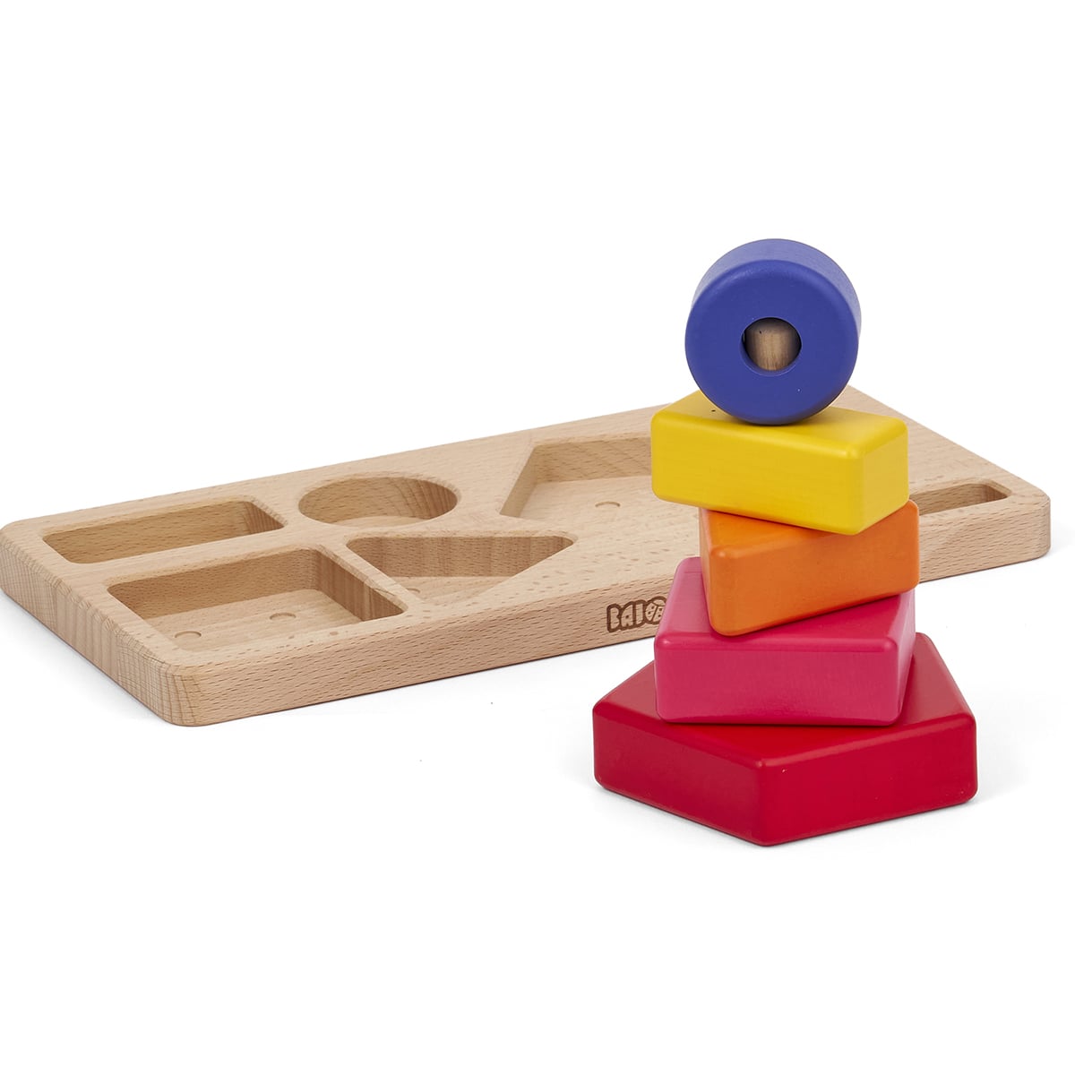 | セット内容 | ブロック5種類(長方形、正方形、丸、三角、五角形)、スタッキング用の棒、土台 |