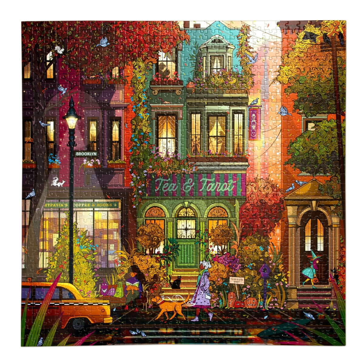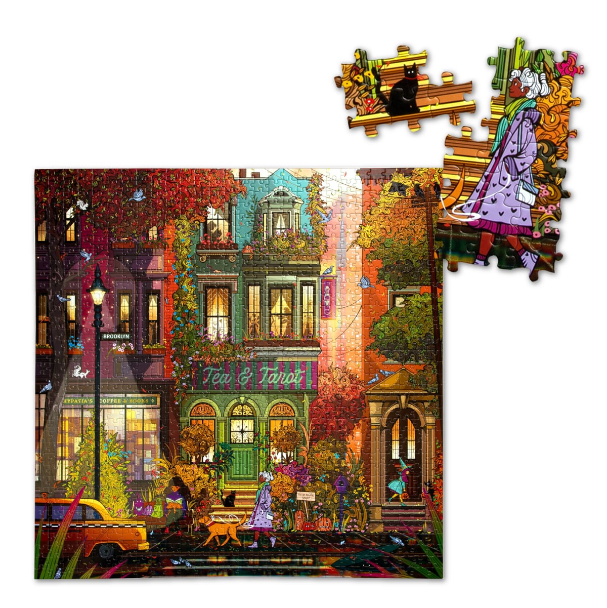 ●モダンなインテリアにも合うグラフィカルな線画:イエローキャブやタロットのお店、大きな窓のタウンハウスなどブルックリンの街並みを描いたデザイン。窓からもれる光と、そこに浮かび上がるシルエットで、「この家のひとは何をしているかな?」とイメージが膨らみます。ピースを探しながら、絵の中のひとびとを見ていると、まるで自分も現地の通りに佇んでいるような臨場感が味わえます。完成したらポスターのように飾って楽しめます。