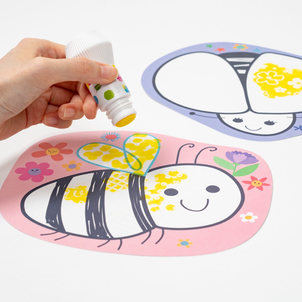 小さな手でもグーにして握りやすく、スタンプのように押せる水性スタンプ・マーカー1色(黄色)と、ポンポンと押すと模様が表れる6種類のデザインシート12枚入りギフトセット。はじめてのお絵描きにおすすめです。