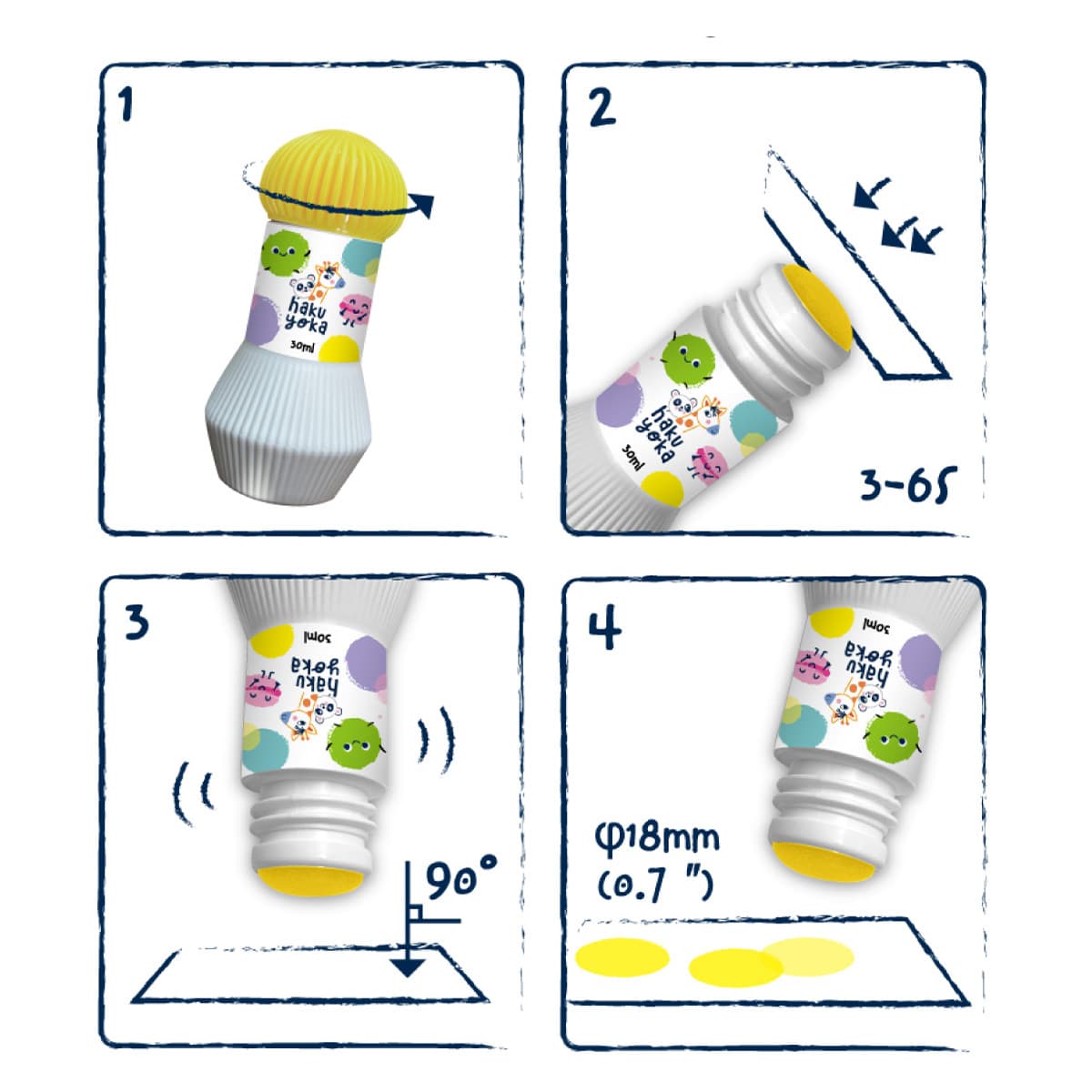 水玉模様、花柄など押す場所によって表れる模様が変化するので、出てくる模様や紙の上に色が付くのを楽しみながら、手の動かし方や力加減を覚えていきます。 なにかを描くというよりも、手を動かすのが楽しい頃にも、デザインシートのおかげで完成度は高くできあがります。 お部屋に飾ってお子様の達成感を高められます。