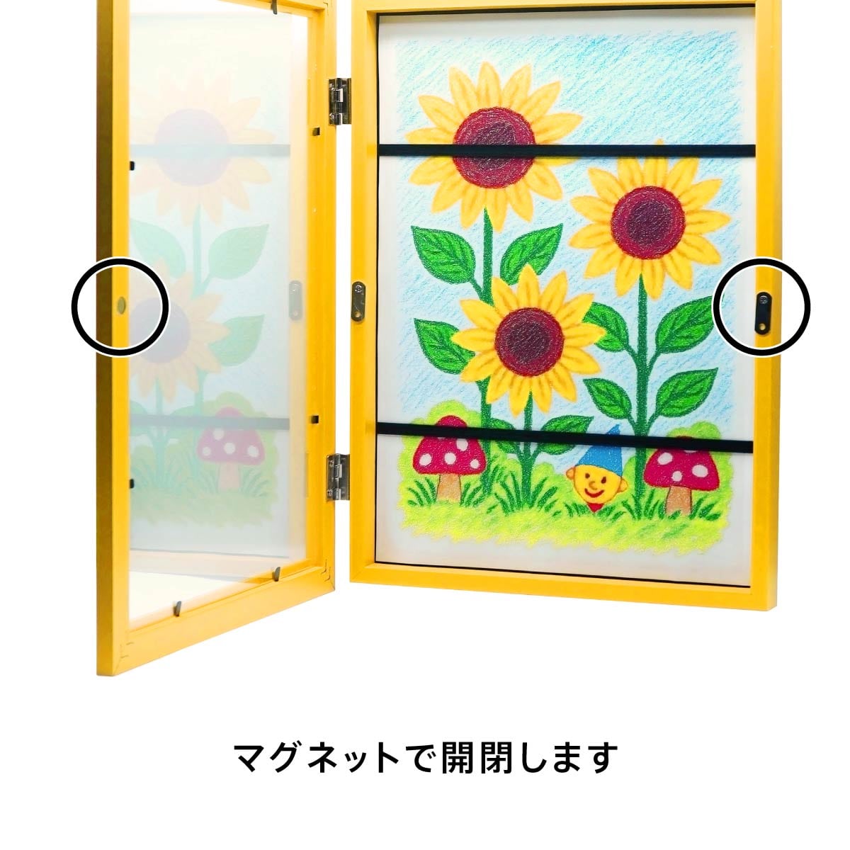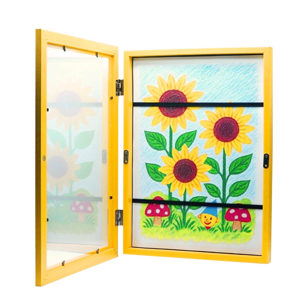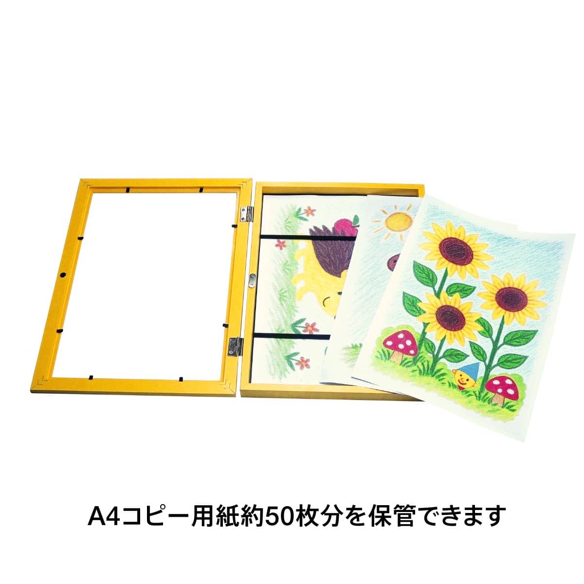 A4サイズの用紙を最大50枚を飾ることができるフレームで、ボックスタイプのため、代表の作品以外もフレーム内部に収納できます。A4サイズの絵以外にも、お手紙や、厚みのない工作を一緒に収めても。