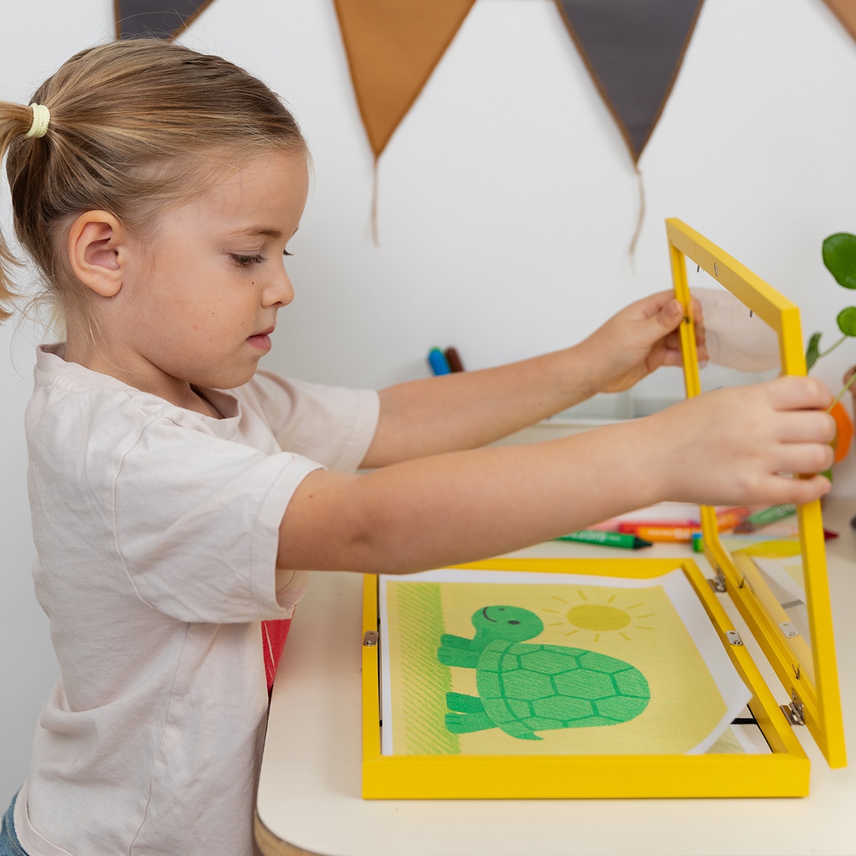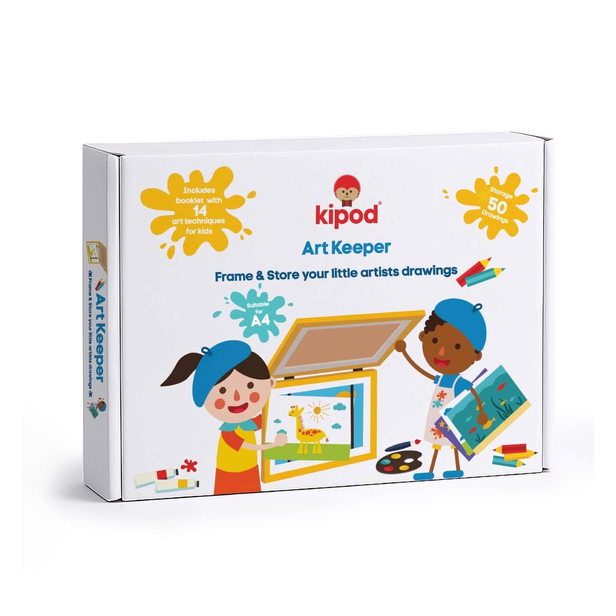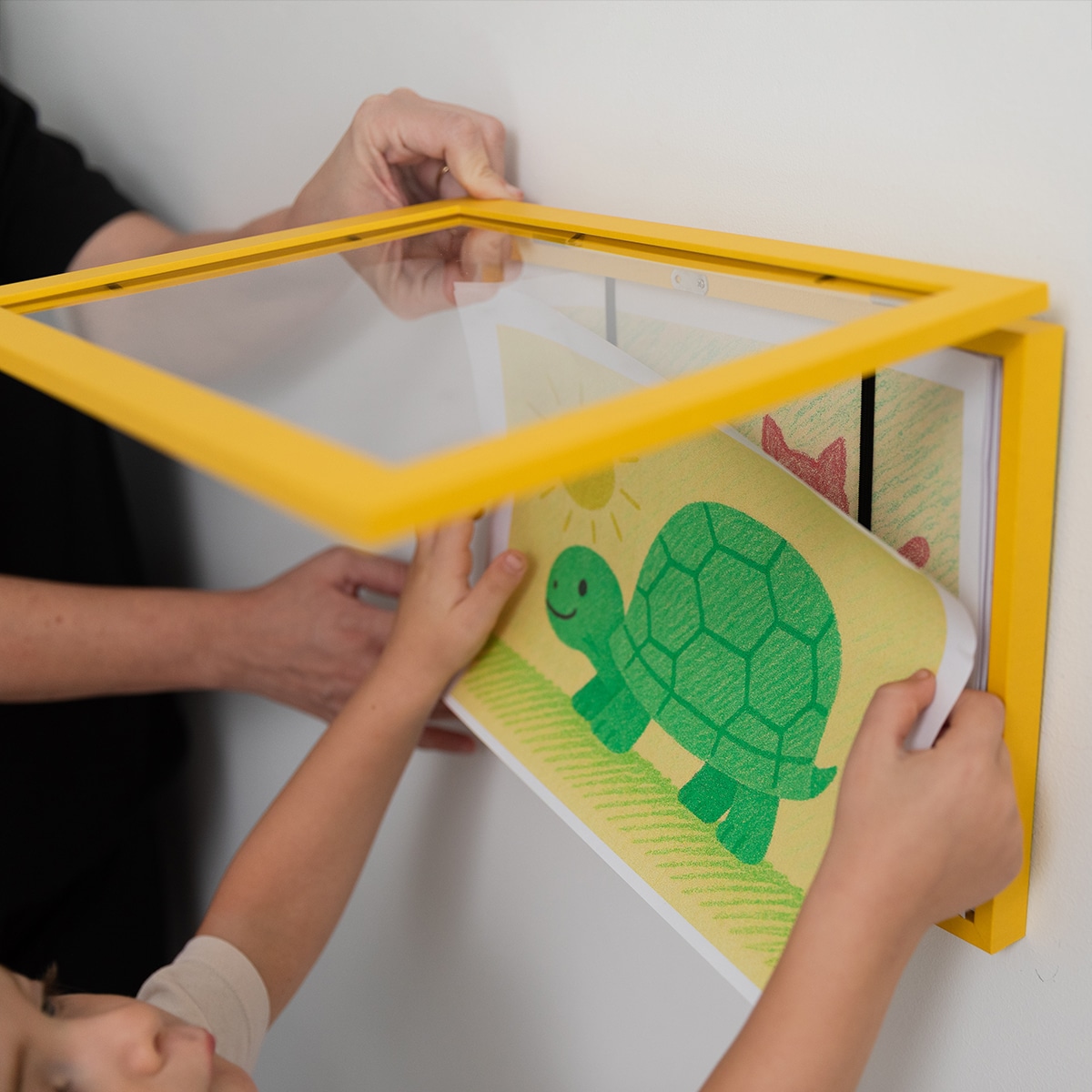 A4サイズの用紙を最大50枚を飾ることができるフレームで、ボックスタイプのため、代表の作品以外もフレーム内部に収納できます。A4サイズの絵以外にも、お手紙や、厚みのない工作を一緒に収めても。