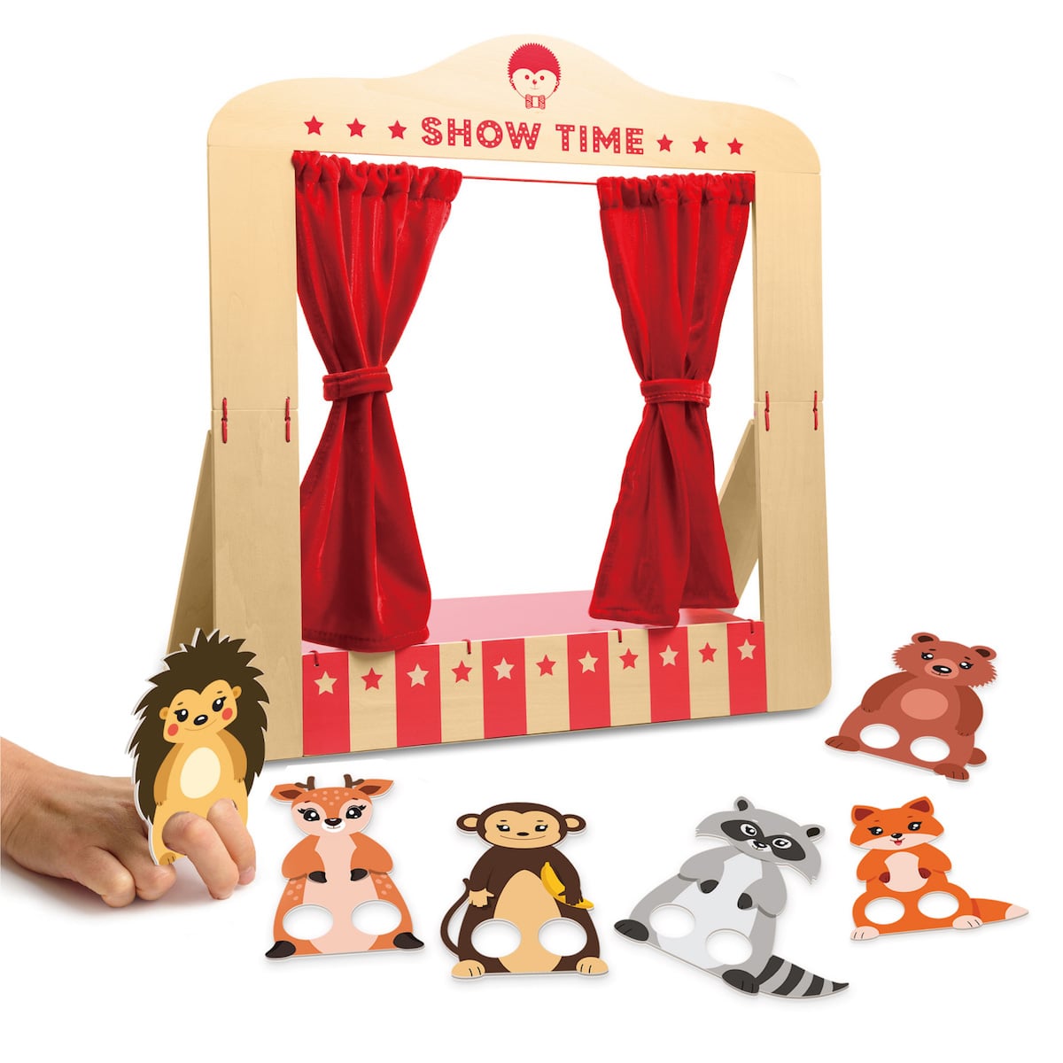 赤いカーテンを開けると、自分専用のシアターに早変わり!付属の6種類の紙製動物パペットや、お気に入りの人形を使って、想像力豊かなショーを演じることができます。パペットは、2つの穴に指を入れると足が動いているように見えて楽しめます。持ち運びや収納に便利な折り畳み式仕様です。