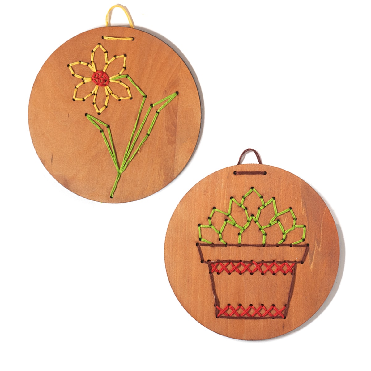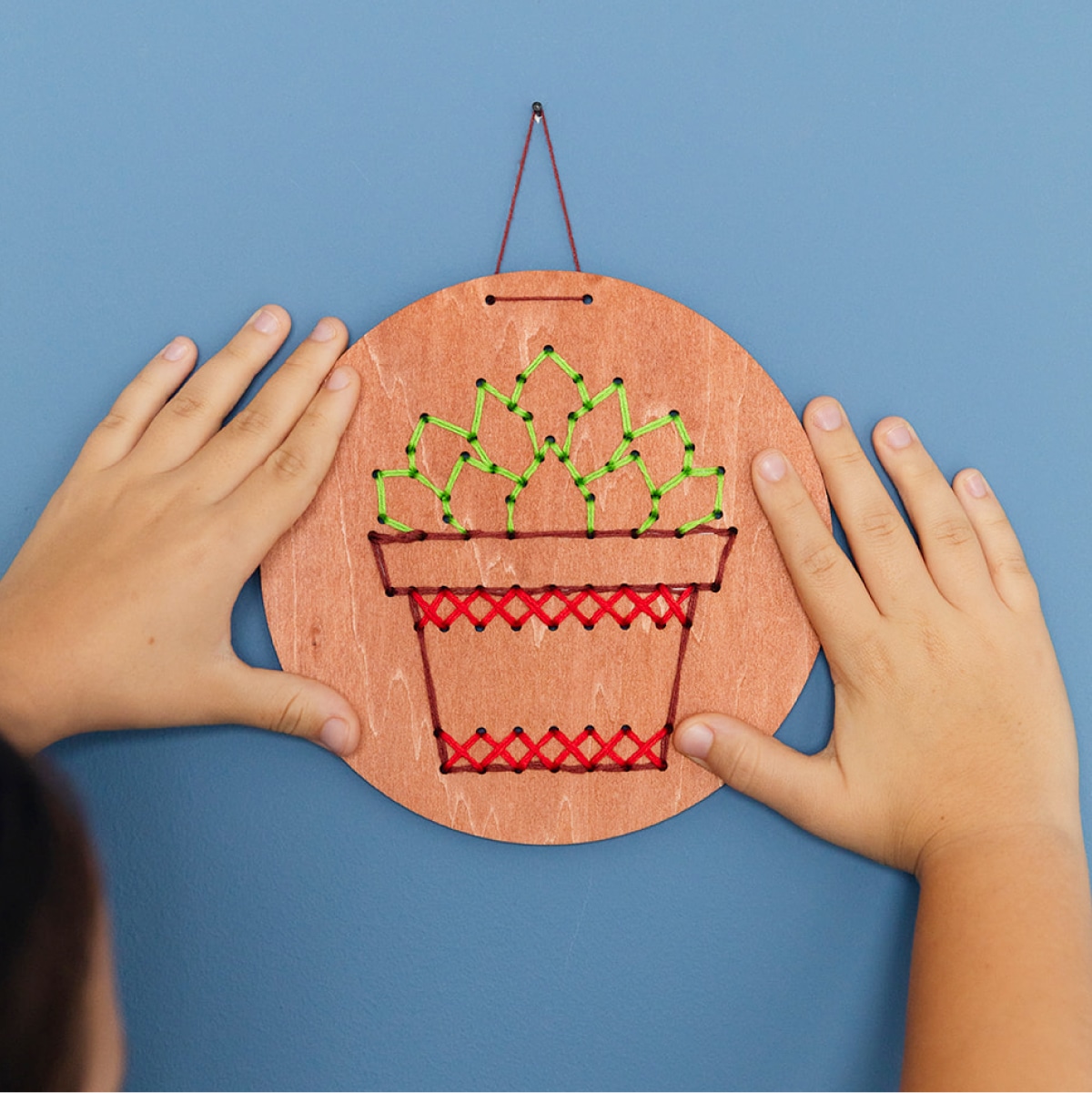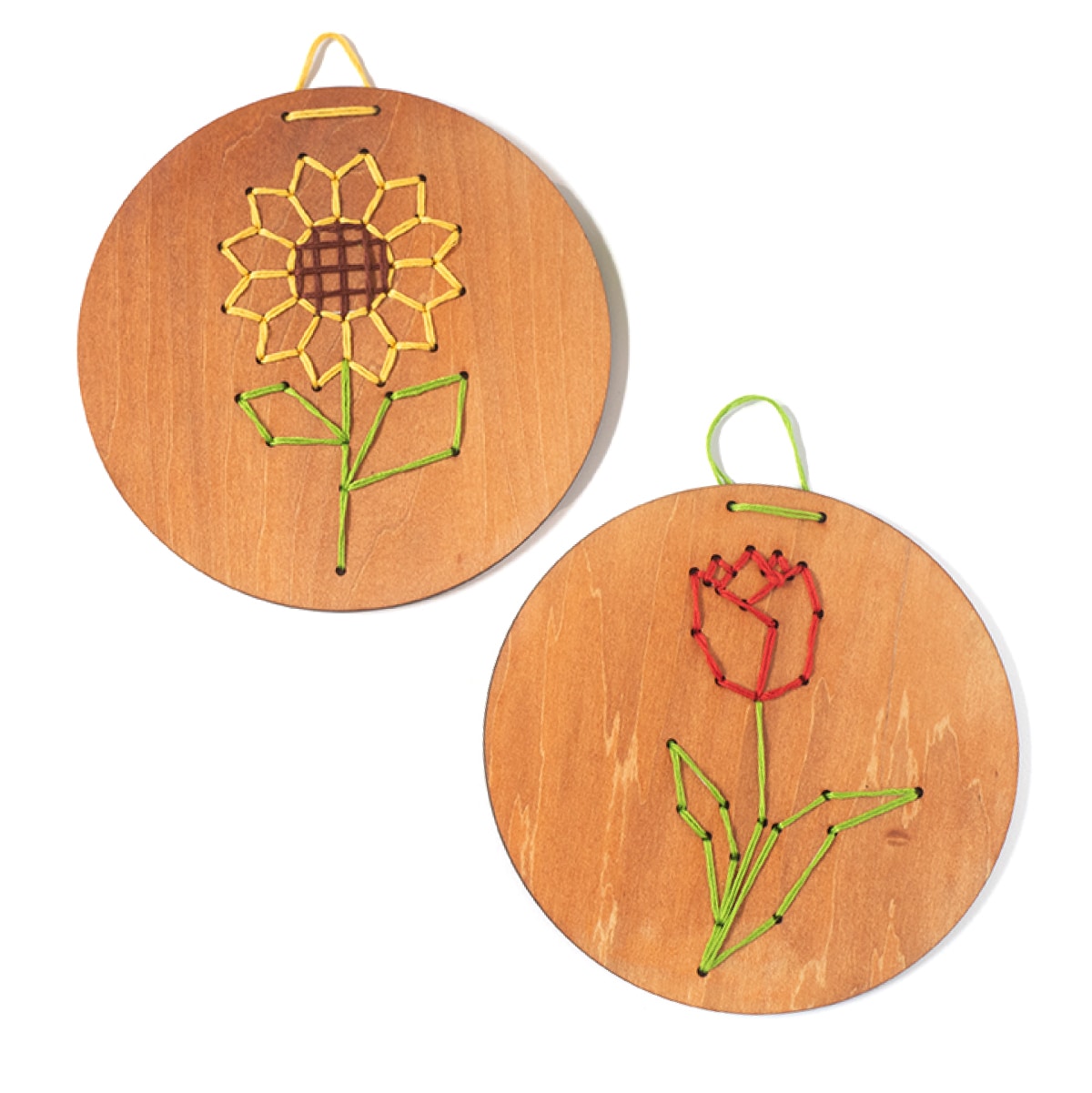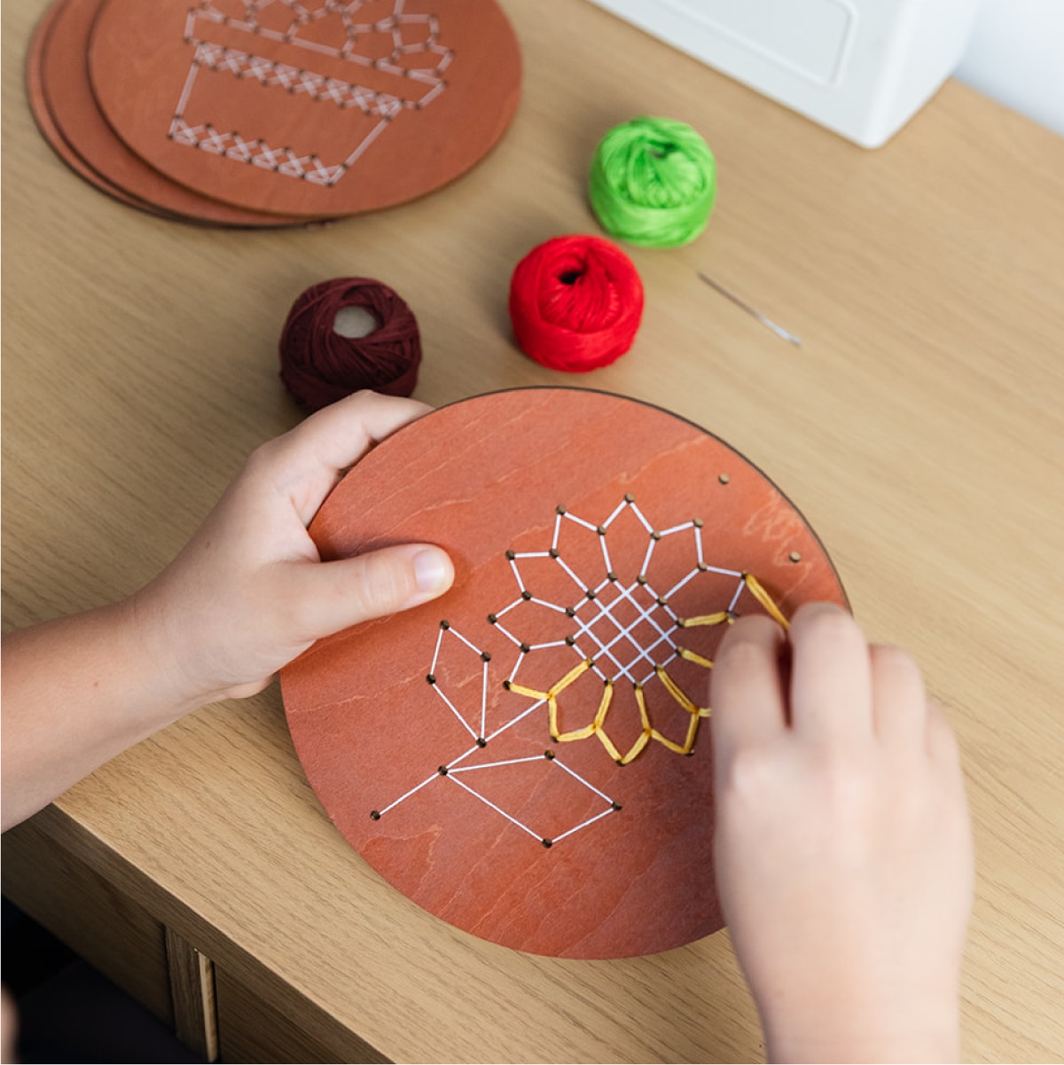 下穴のついた木製ディスクにステッチを施して、自分だけのウォールアートを作り上げるアクティビティ。