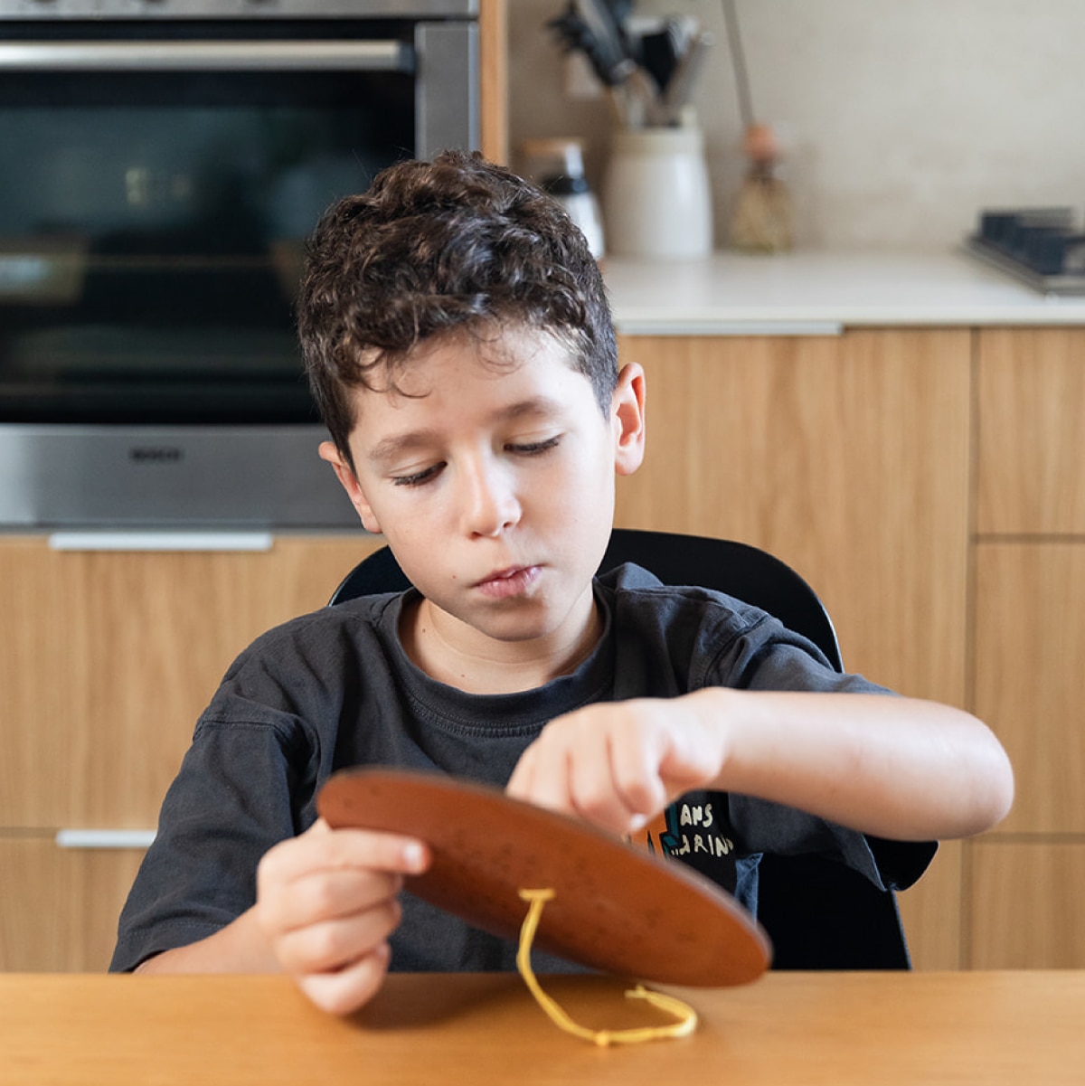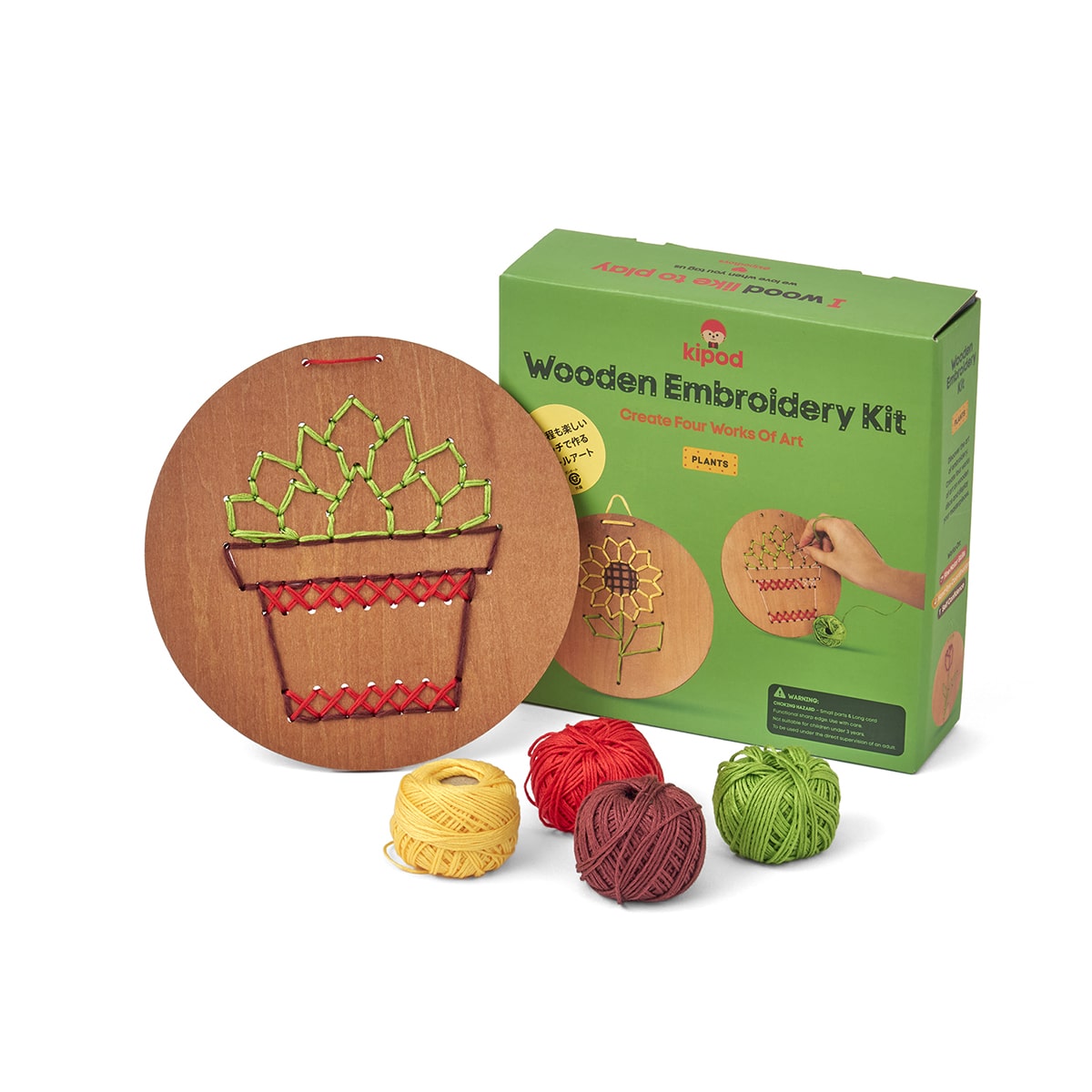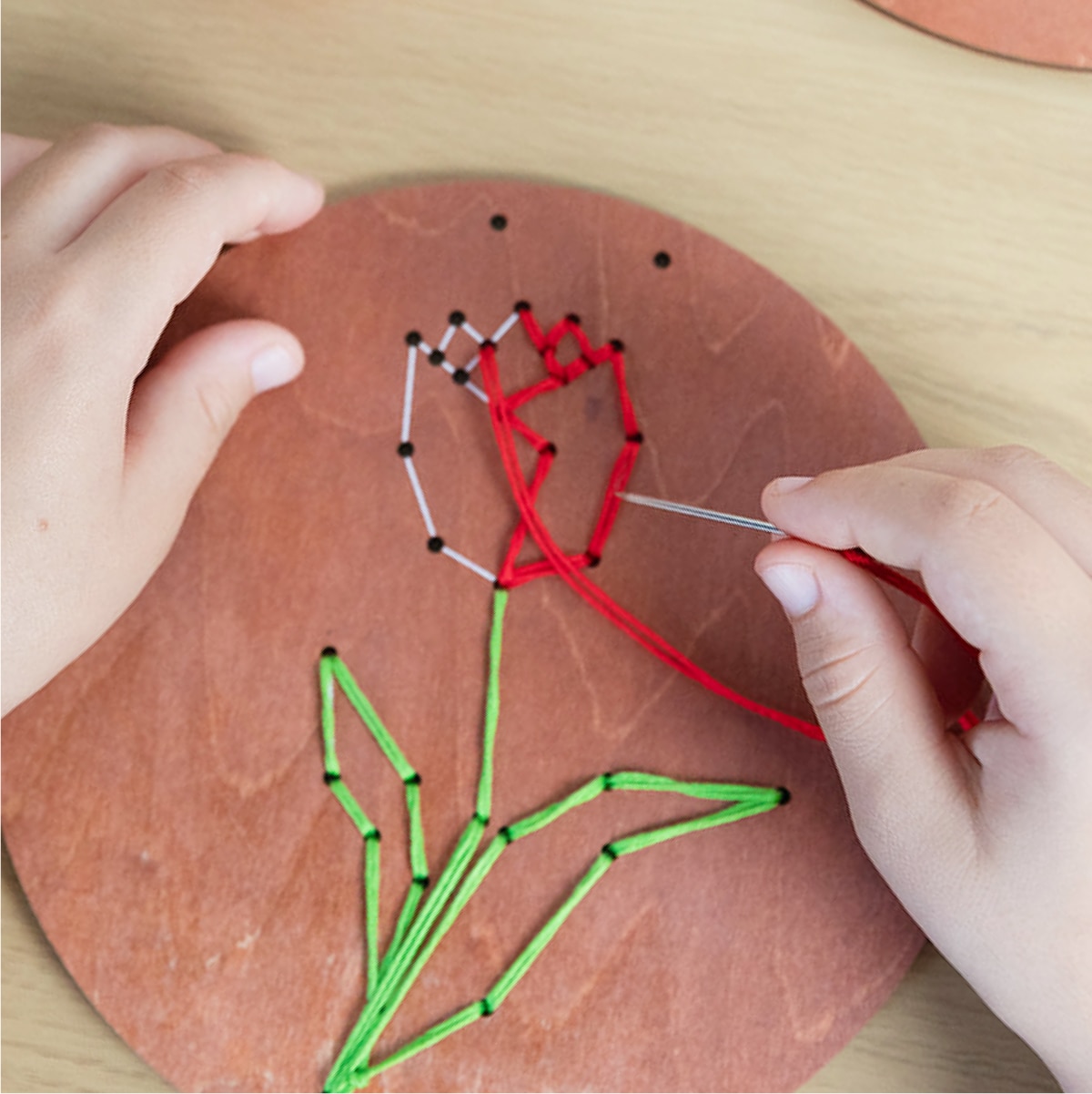 ・針を使う工作や裁縫をはじめる頃に。下穴が開いていて固さのある木製ディスクは、慣れない頃にも針の運びが練習しやすいです。下穴の数も多すぎず、飽きずに完成させられます。