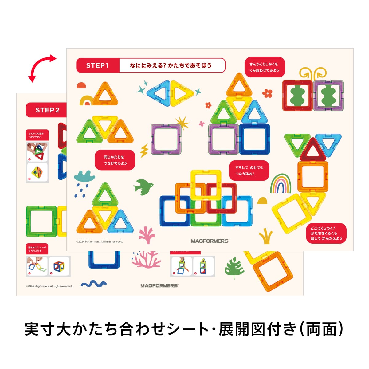 かたち合わせシートのSTEP1は平面遊び。原寸大シートにピースを重ね、「なににみえる?」と問いかけることで、子どもの想像力を引き出します。STEP2では立体シートに挑戦。4つの組み立てテクニックを試しながら、立体づくりの楽しさを体験できます。