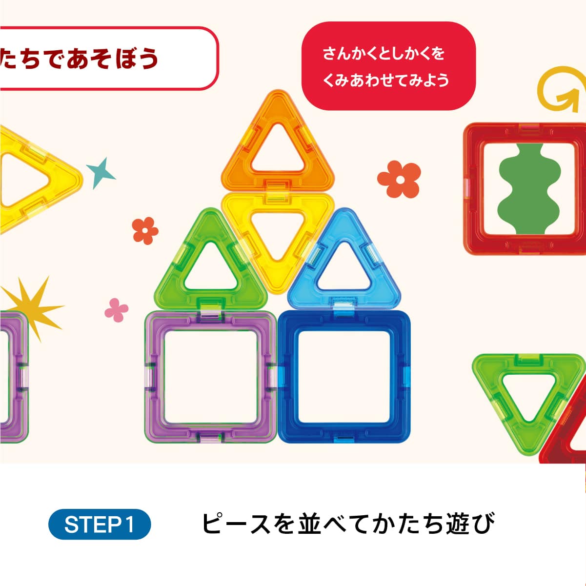 世界63ヶ国で話題の数学センスを育む図形あそび。磁石(マグ)で形づくる(フォーム)という名の通り、磁石でつながる数学ブロックです。磁石が瞬時にカチッとつながるスピード感が子どもから大人を魅了します。人気の3つの理由は、@瞬時につながる、こわせる A2次元と3次元の行き来が自在 B全方向でつながる。