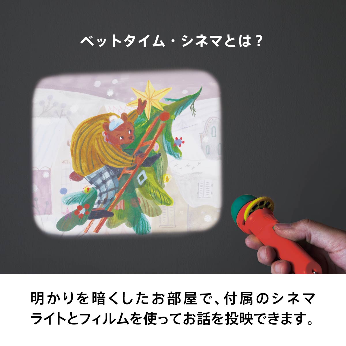 いつもは、にぎやかな音や明かりに溢れているおうちの中。テレビや電気を消して、天井や壁にシネマライトを向けるだけで、親子のお話会がはじまります。 暗闇の中でお互いの声だけに耳をすます「家族だけの親密な時間」は、ずっと心に残る大切な記憶になります。