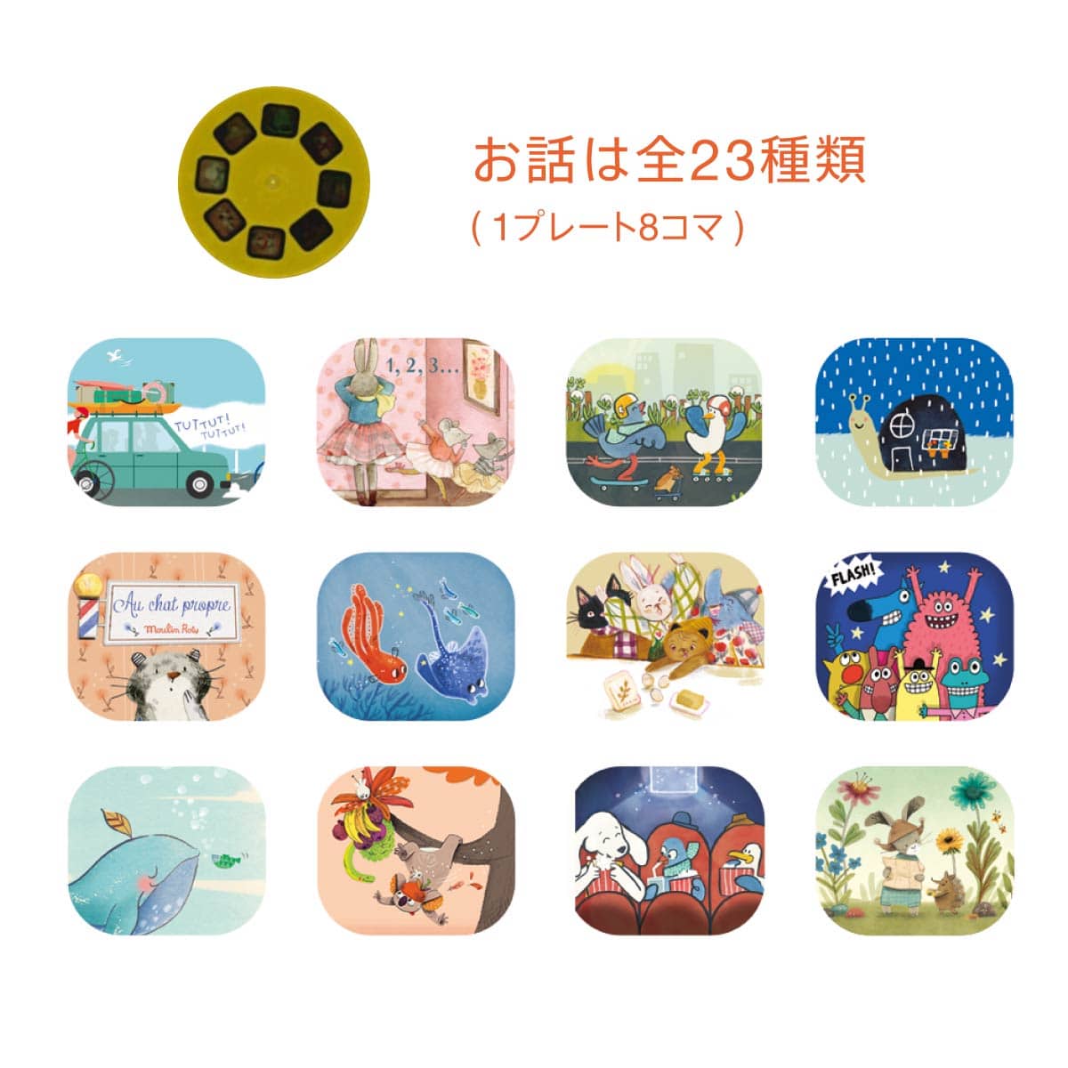 1日ごとに扉を開けると、登場人物が異なる8つのシーンが描かれたフィルムディスクが入っています。自分で作ったお話を家族に聞いてもらう時間は、どんな考えや発想をしてもいいんだと受け止めてもらえる空気感をつくり、自信や肯定感につながる素敵な時間になります。