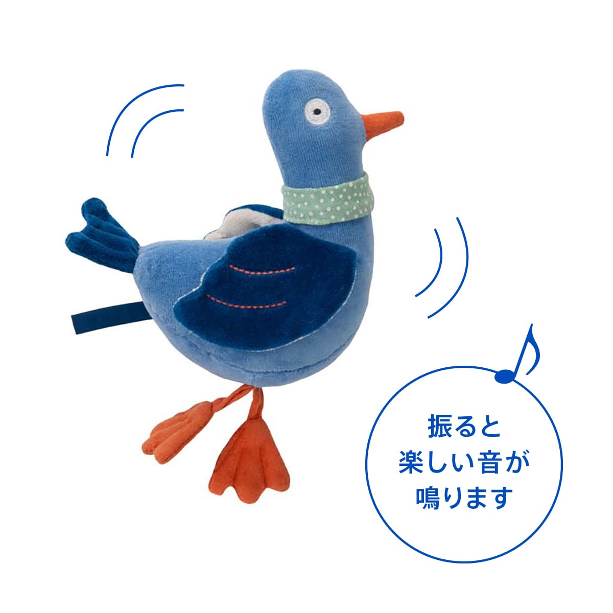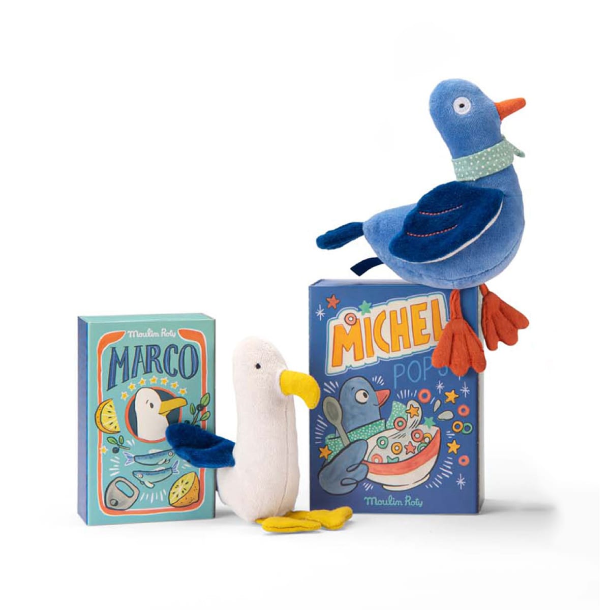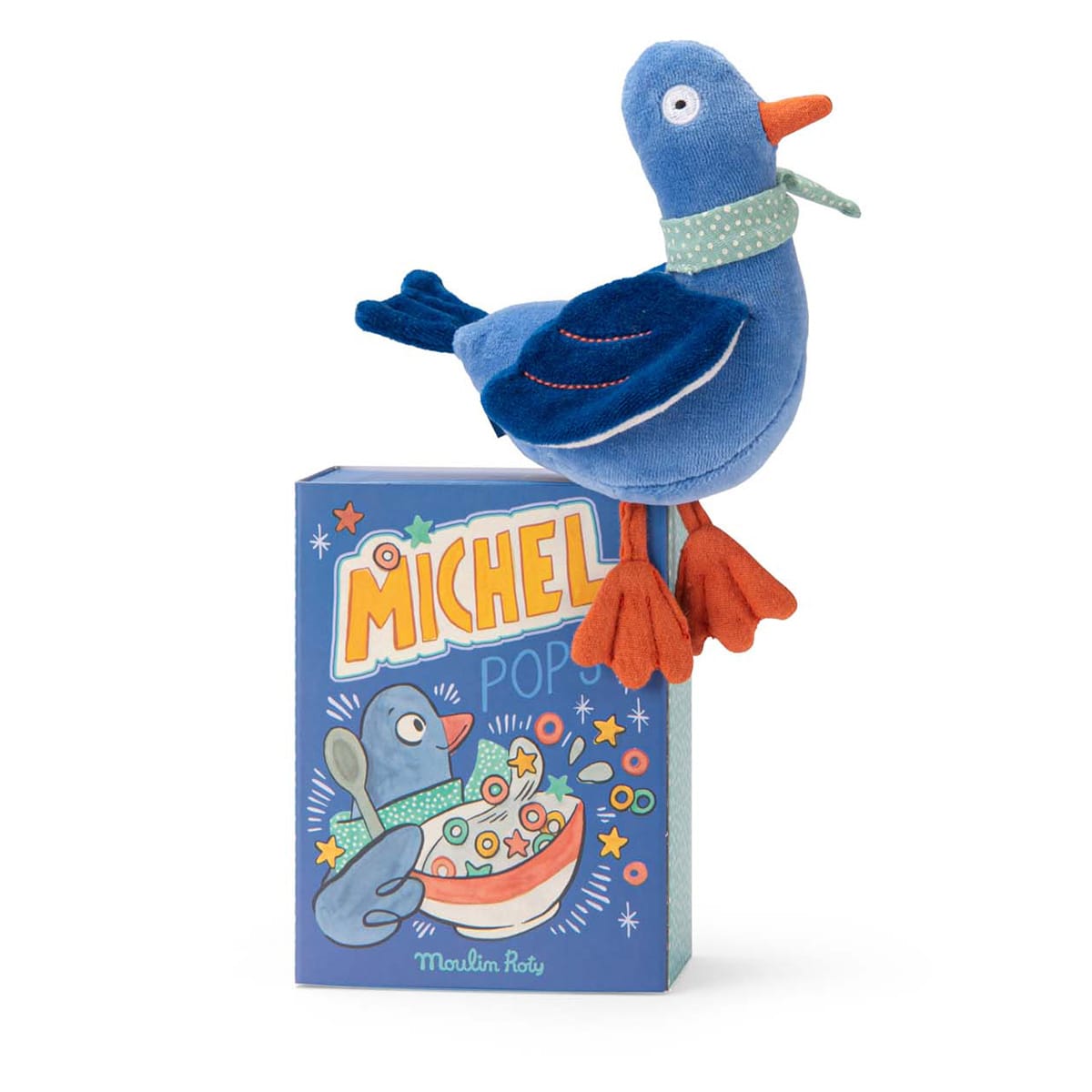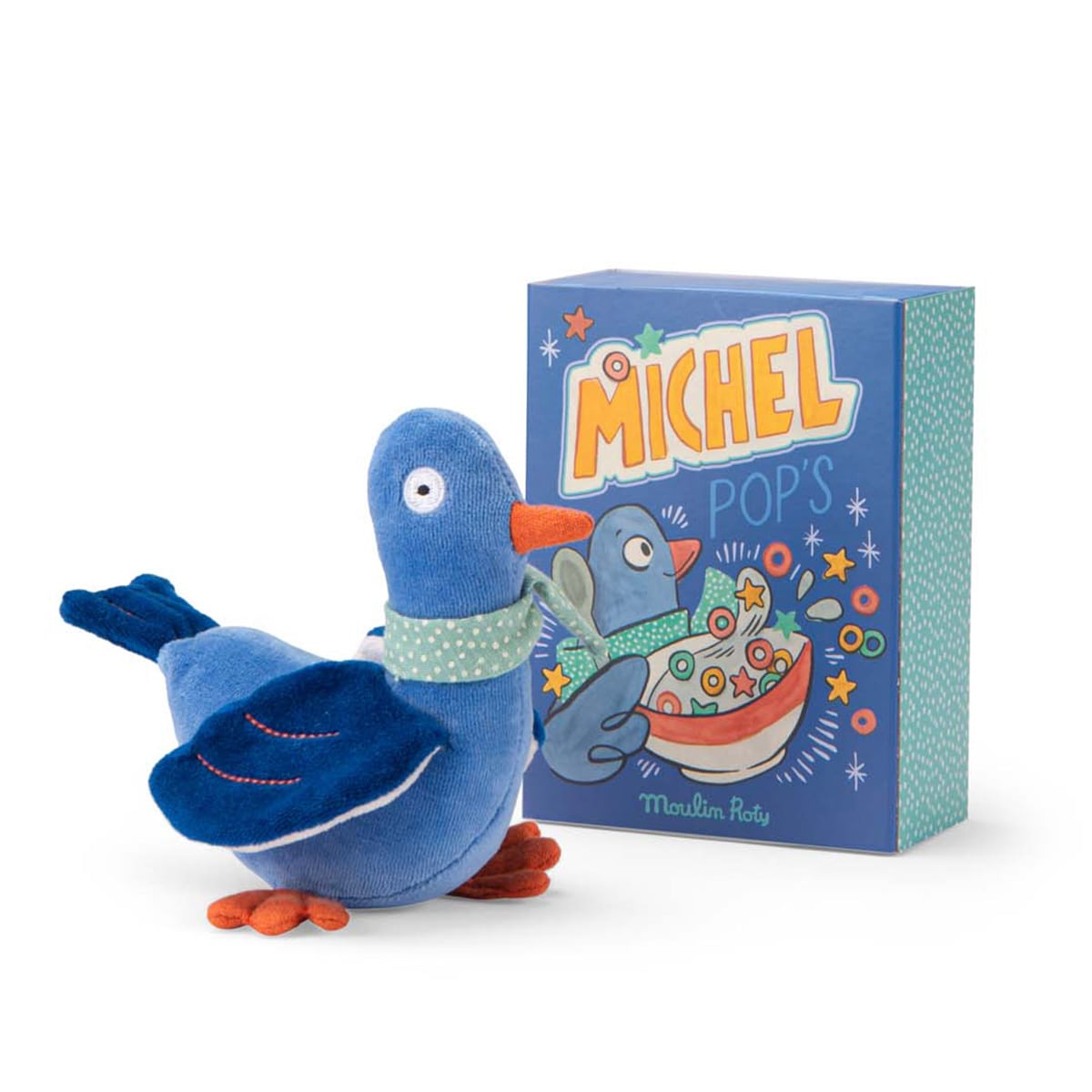 おしゃべり好きなハトのミシェルのラトル。ハトは昔からパリのアパルトマンに集う仲間のシンボルです。ギフトBOXには、80年代に子どもが大好きだったフルーツシリアルのイラスト入り。