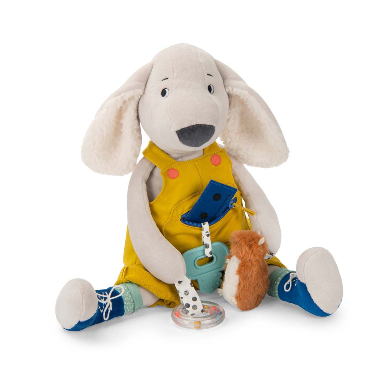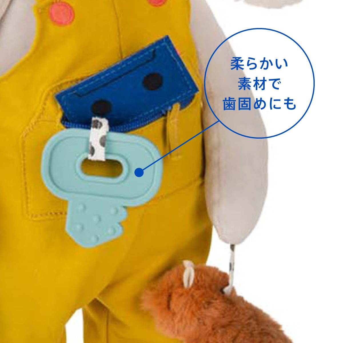 そんなピルーが、赤ちゃんの新しい生活にそっと寄り添う、遊びのパートナーになりました。いたずら好きでやさしい大きなのPilou(ピルー)のぬいぐるみ。赤ちゃんの“はじめての遊び”をたっぷり詰め込んだ、五感で楽しめるアクティビティトイです。音・手ざわり・動きなど、さまざまな感覚を使って遊ぶことで、自然と「見る・聞く・触れる・握る・噛む」といった基本的な動作を引き出してくれます。