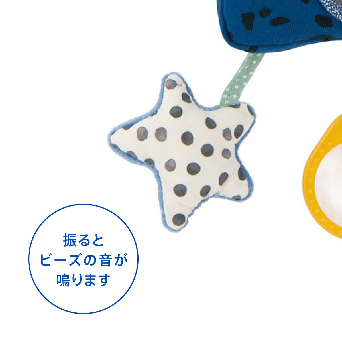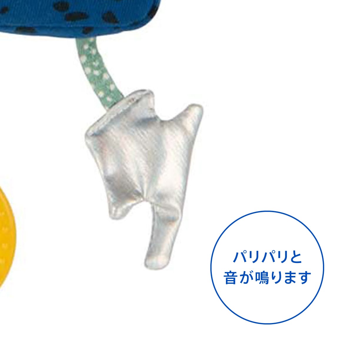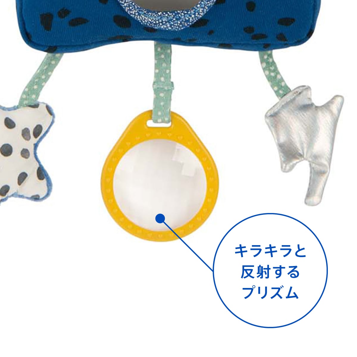 中央のレンズは安心してあそべる割れないプラスチック・ミラー、カラカラと音がなる星、光を集めてキラキラと揺れるプリズム、フラッシュをイメージしたパリパリと音のなるしかけ。ひっぱったり、口に入れたりして遊ぶことができます。カメラの中にはカランコロンときれいに響く鈴が入っています。