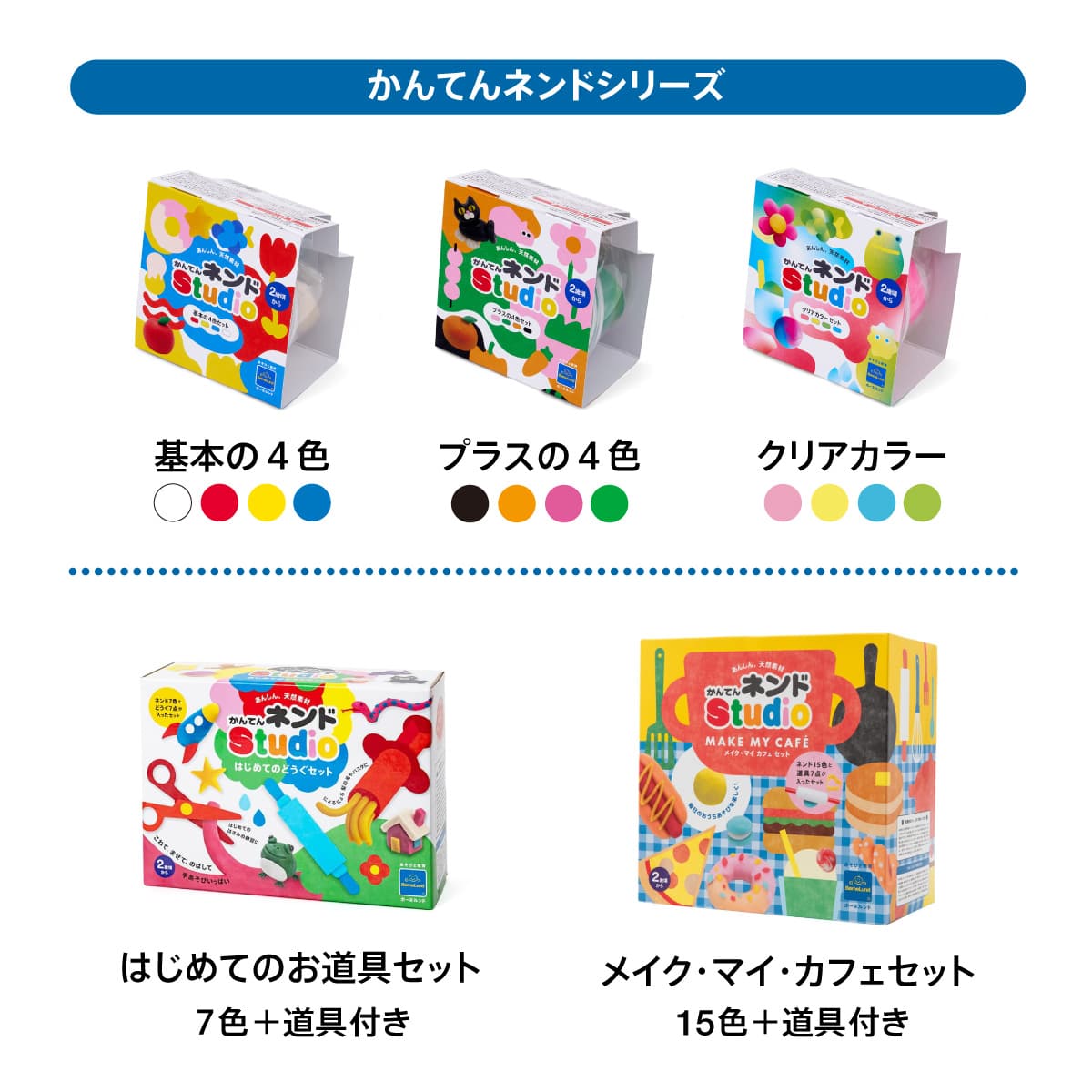 1色から買い足しができる単色、3原色+白の4色セットをはじめ、たっぷり遊びたい方におすすめの8色セットなど、お子さまの興味、遊ぶ人数やシーンにあわせて選べます。