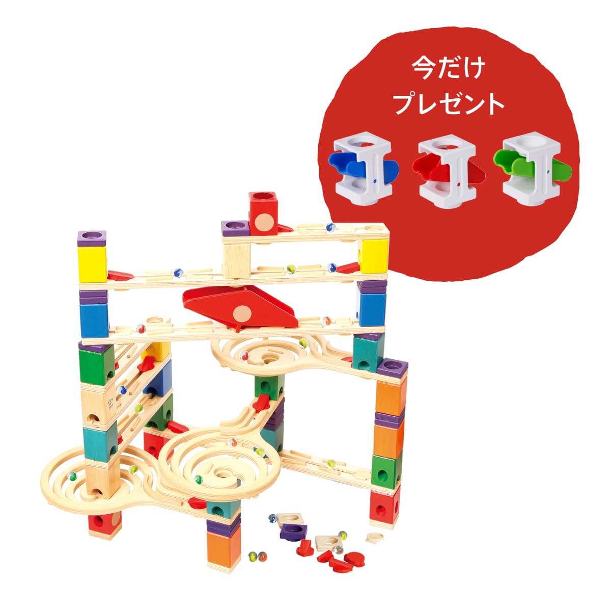 | セット内容 | ●セット内容:ブロック(8種類)×24、スパイラルレール×3、直線レール(長)×3、直線レール(短)×4、シーソーパーツ×1、補足パーツ(5種類)×48、ビー玉(袋入り)×50、コントロールブロック×3種 |