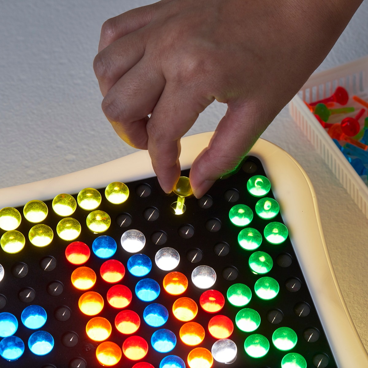 6色の透明なペグを黒いスクリーン上のスリットへ差し込み、色と光の表現遊びが楽しめます。