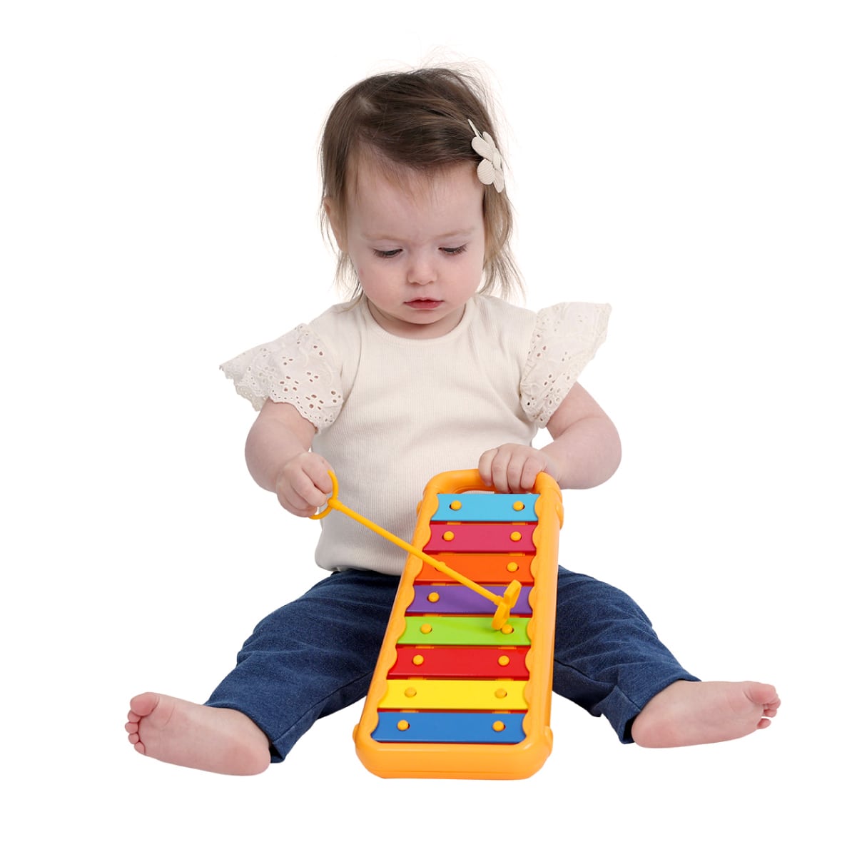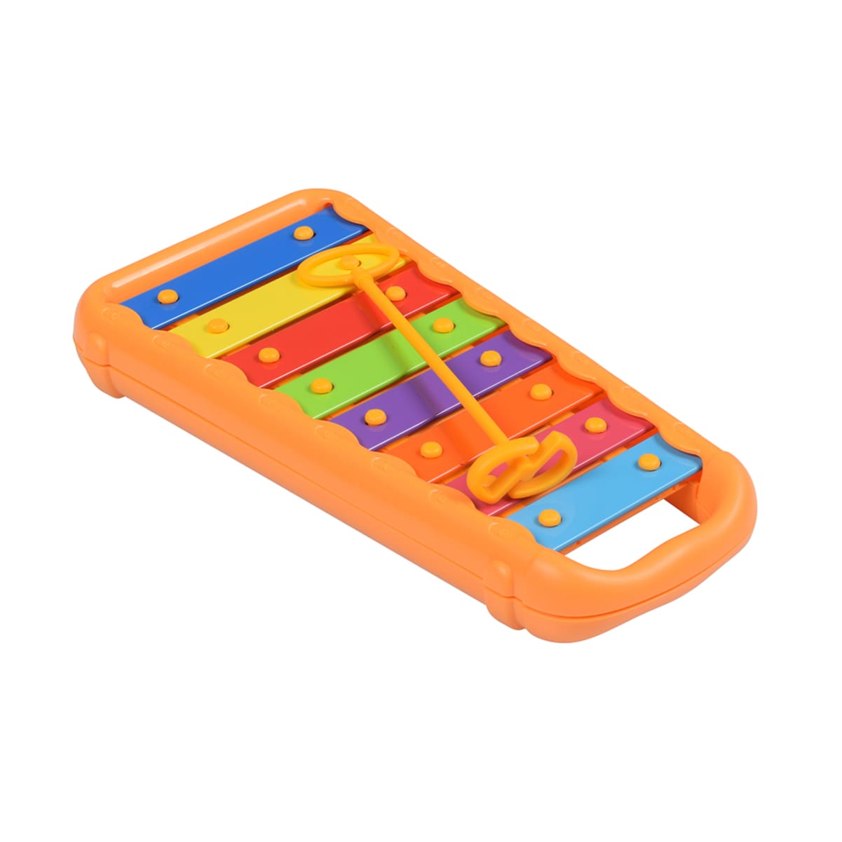 マレットで奏でる1オクターブの鉄琴。ドレミやメロディーに親しむころまで使えます。鍵盤と同じ色の音符で書かれた楽譜付き。