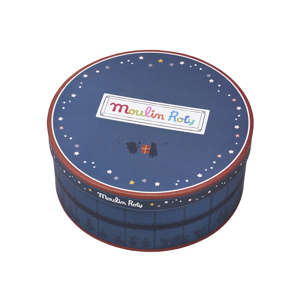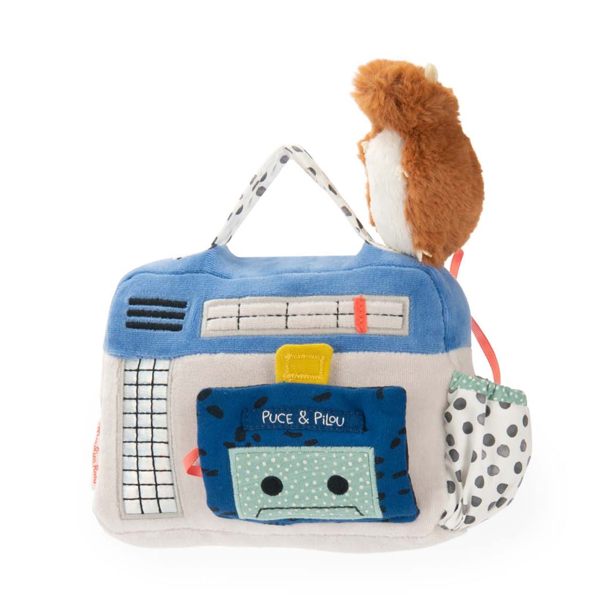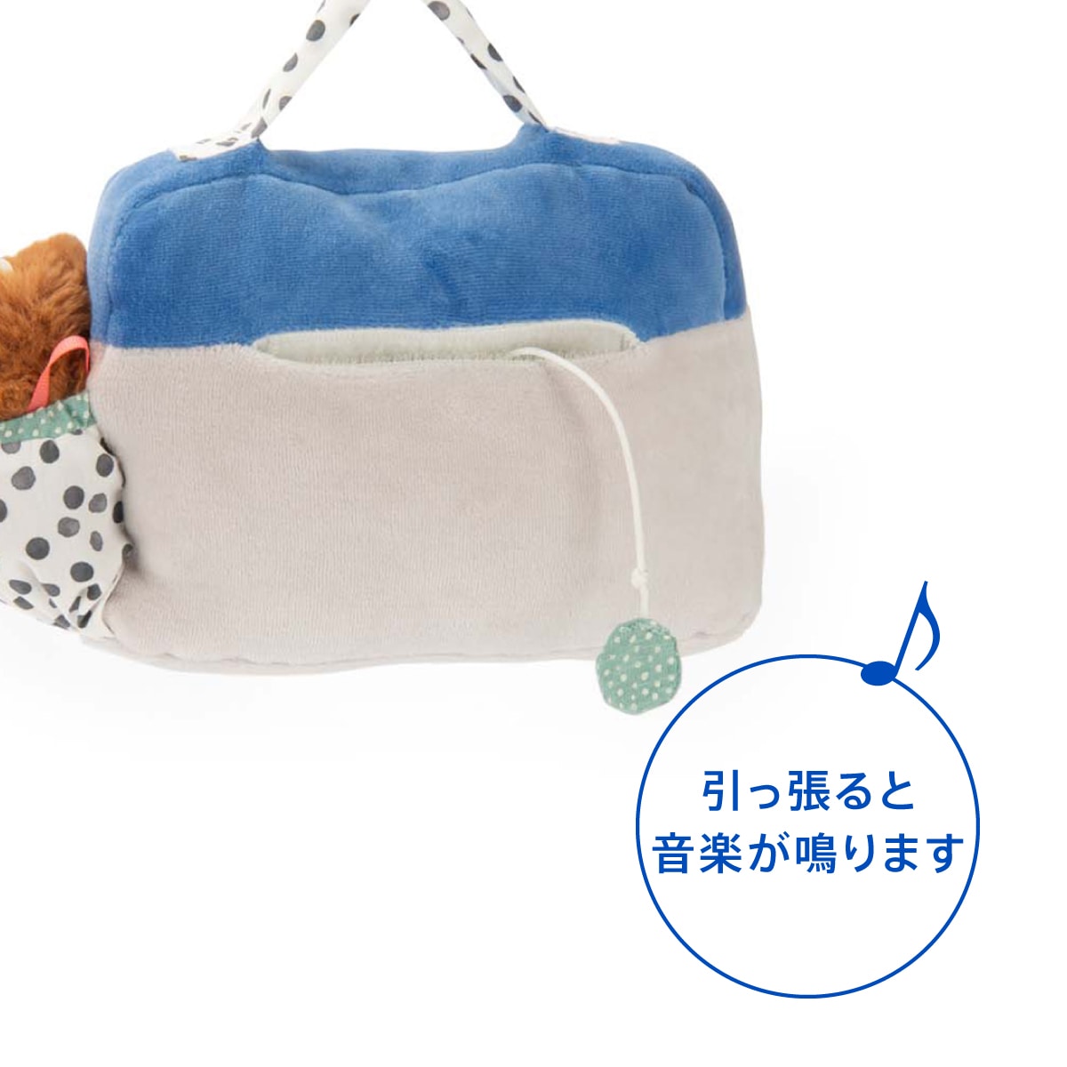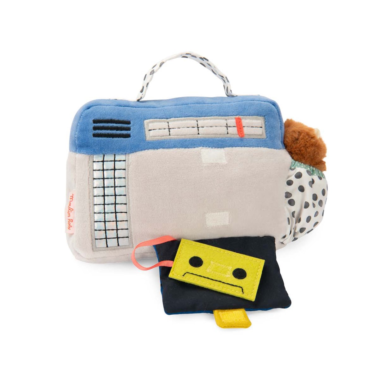 ラジカセをかたどった布製のオルゴール。裏面のひもをひっぱると、80〜90年代に活躍したフランスのフォークシンガー エチエンヌ・ダオのゆったりとした心地よいメロディーが流れます。入眠にも、サイドポケット隠れたハムスターとお話あそびにも活躍。