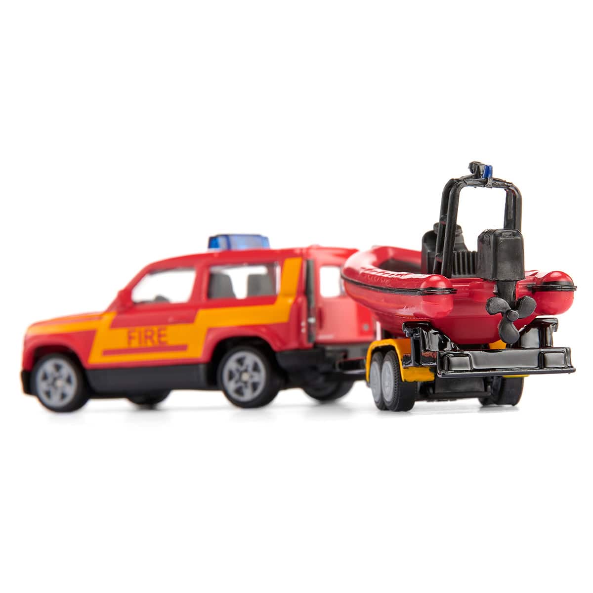 タフな大型オフロード車、ランドローバー ディフェンダーの消防車モデルが、モーターボートを牽引するセットで登場しました。