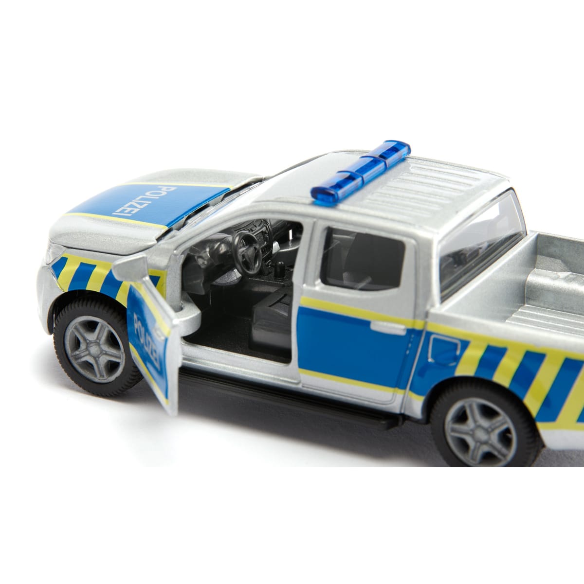 世界中で活躍する日産のピックアップトラック「ナバラ」をモデルにした警察車両。頑丈さと高い走破性を備え、過酷な特殊任務でも活躍。災害時には荷台に資機材を積み込みます。実車さながらの力強いボディラインに、ドイツ警察仕様のカラーリングやホワイトの警察文字が目を引くデザインです。ボンネットやドア、テールゲートが開閉し、運転席やエンジン部分まで細部を楽しめる一台です。