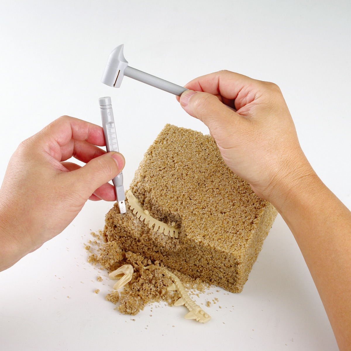 実際の恐竜の化石の「発掘」と同じような体験ができる2体の恐竜の骨が入った「ティラノ&スピノ」のキット。恐竜の骨がうまった砂の塊を、ハンマーとノミで堀り出していき、まさに考古学者気分が味わえます。
