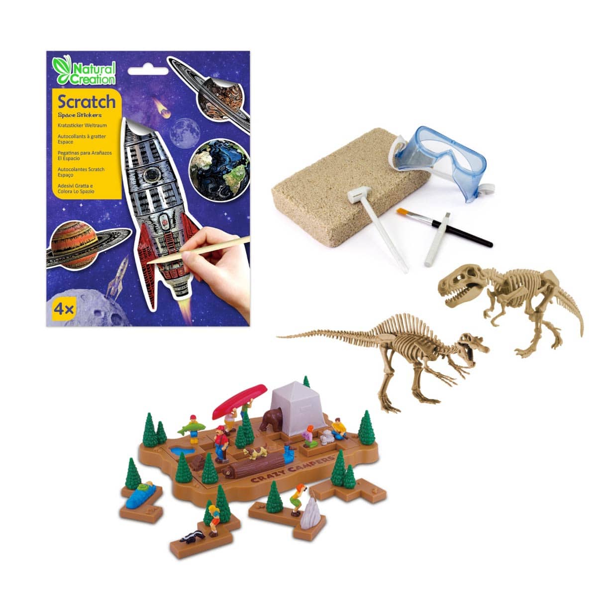 長い休みこそ、たっぷり時間をかけて遊べるアイテムに挑戦しませんか?「頭脳パズル」「化石発掘キット」「スクラッチアート」は、それぞれにじっくり集中して取り組めます。また、あそびの種類もバリエーション豊かに揃っているので、毎日の気分や予定に合わせて遊びを変えて楽しめます。親子で一緒に「できた!」を楽しめる、おうち時間にぴったりのセットです。