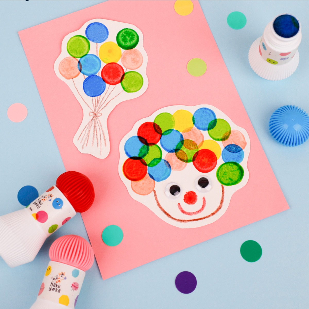 小さな手でもグーで握りやすく、 ポンポンと押すと丸が描ける基本の5色の水性スタンプマーカーです。