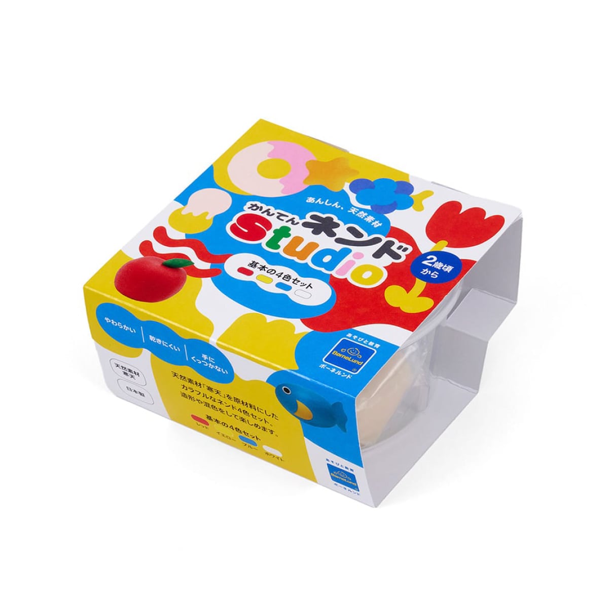 天然素材の寒天、にがり、塩、食品色素を主原料にしている日本製のボーネルンドオリジナルネンドです。乾きにくく、手でこねると柔らかくなり、手やテーブルにもくっつきにくいのが特徴。はじめは、こねる・伸ばす・丸めるなど手指を使って感触遊びを楽しみ、色と色を混ぜて新しい色を作ったり、想像した形をつくったり、成長ごとのあそびが広がります。
